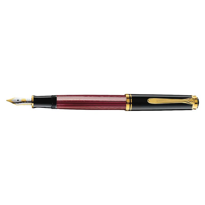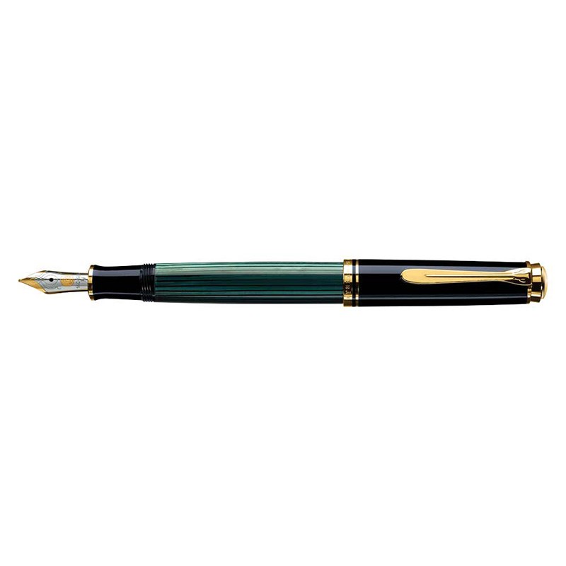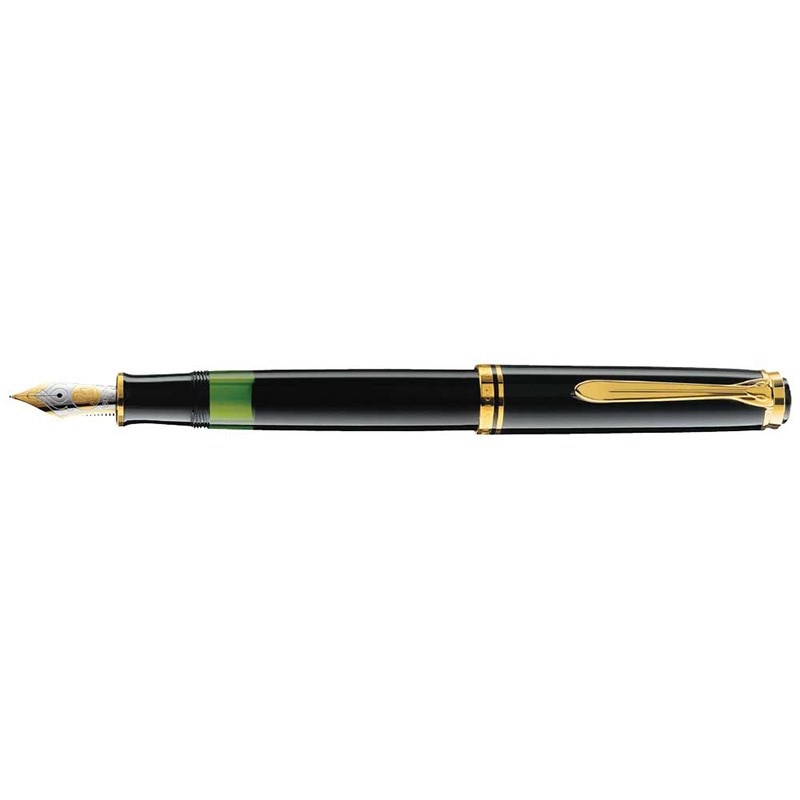 Pelikan Souverän® M400 nalivpero s tijelom izrađenim od dijamanta obrađene visokokvalitetne smole i 24-karatnim pozlatom. Vrhovi klipnog punila izrađeni su od 14 karata / 585 zlata. Čvrsti mesingani dijelovi za punjenje za punjenje klipa osiguravaju veliki kapacitet tinte s vidljivim pokazateljem razine tinte kroz prozirni dio cijevi. Pozlaćena Pelikan kopča u obliku kljuna. Debljina pera F (fine).