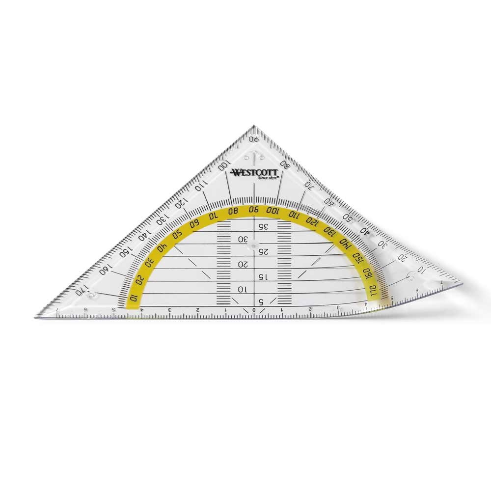 Geometrijski trokut skalom u centimetrima, kutomjerom, okomitim i kosim crtama za jednoručno crtanje ili mjerenje. Elastično i nelomljivo (polystyrene).