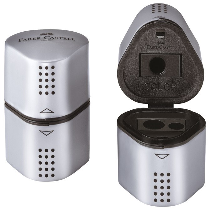 Visokokvalitetno šiljilo sa spremnikom i poklopcem. PVC kutija. 3 rupe za trokutaste, šesterokutne i okrugle olovke standardne debljine i Jumbo. Ergonomsko trokutasto tijelo s patentiranim gripom za sigurno, ne klizno držanje. Veliki obostrani spremnik za otpad. Poznati Faber Castell Grip 2001 dizajn.