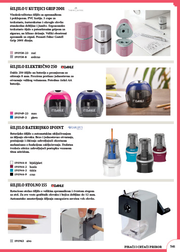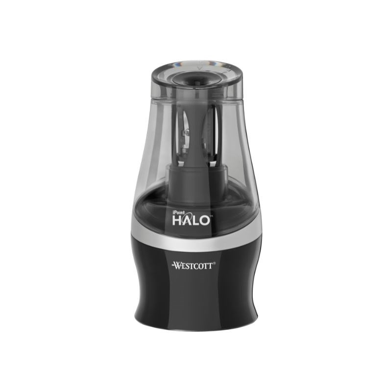 Baterijsko šiljilo s automatskim uključivanjem za šiljenje olovaka. Brzo i jednostavno otvaranje, pražnjenje i čišćenje zahvaljujući okretnom mehanizmu s funkcijom zaključavanja. Dodatna tvrdoća oštrice zahvaljujući postupku vezanom titan nitridom. Potrebne 4 x AA baterije, nisu uključene. Promjer 7 cm, visina 14 cm, 178 g.