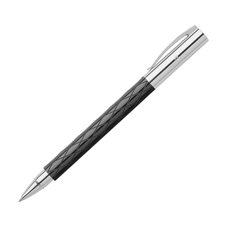 Elegantan roler u poklon kutiji. Tijelo olovke izrađeno je od crne dragocjene smole visokog sjaja s utisnutim rombovima. Moderan i luksuzan izgled. Poklopac s klipsom i vrh izrađeni su od kromiranog poliranog metala. Boja tinte crna, brzo se suši.