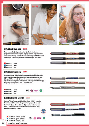 Roler s "okom" za pregled količine tinte. Već 20 godina favorit na tržištu rolera zbog savršenog ispisa do zadnje kapi tinte ("uni-flow" sistem). Pigmentna vodootporna tinta s certifikatom za upotrebu na dokumentima. Vrh karbidna kuglica 0,5 mm.