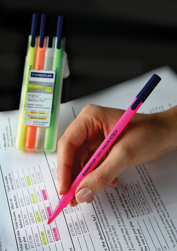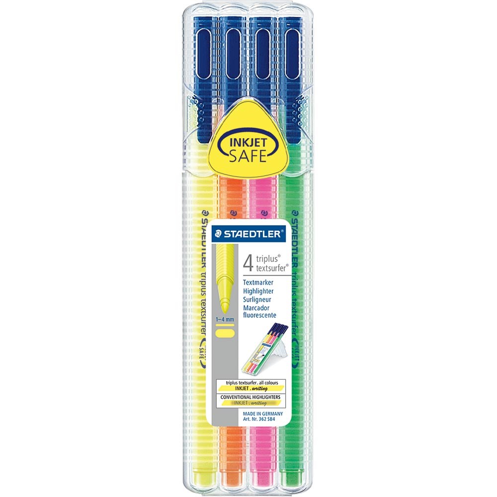 Uski marker za označavanje teksta s trobridnim tijelom i poklopcem. Ergonomski trokutasti oblik. Idealno za isticanje sitnog tiska. INKJET SAFE - ne razmazuje inkjet ispise. Neonska tinta na bazi vode. Brzo se suši. Airplane safe - automatsko izjednačavanje tlaka sprječava curenje olovke u zrakoplovu. Širina ispisa 1-4 mm. Dostupno u stand-up STAEDTLER kutiji