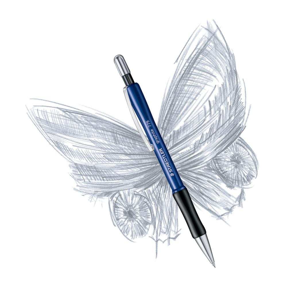 Profesionalna tehnička olovka za pisanje i crtanje. Plastično tijelo s gumenim prstohvatom za ugodno držanje, metalnom mehanikom, stiskačem, klipsom i vrhom. Obloženi kabel za visoku razinu otpornosti na lomljenje. Gumica bez PVC-a i lateksa.