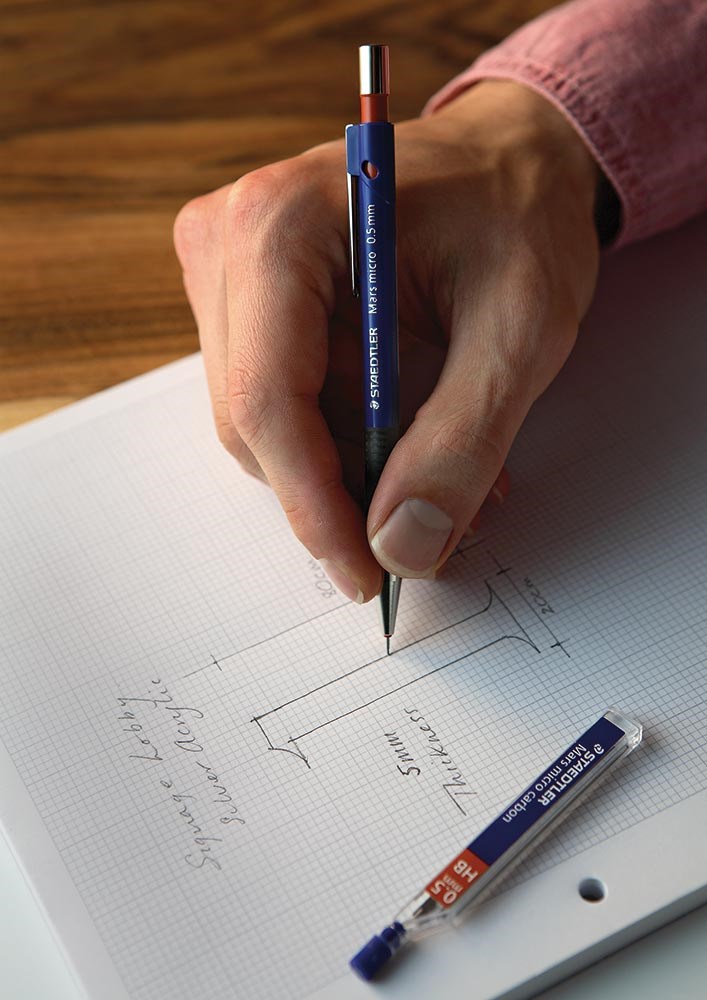 Tehnička olovka za pisanje i crtanje. Kruti, cilindrični olovni vrh, idealan za upotrebu s ravnalima i predlošcima. Protuklizna zona gume. Metalna kopča, tipkalo i vrh. Sigurno u džepu zahvaljujući uvlačivoj olovnom vrhu. Visoka razina otpornosti na pucanje.