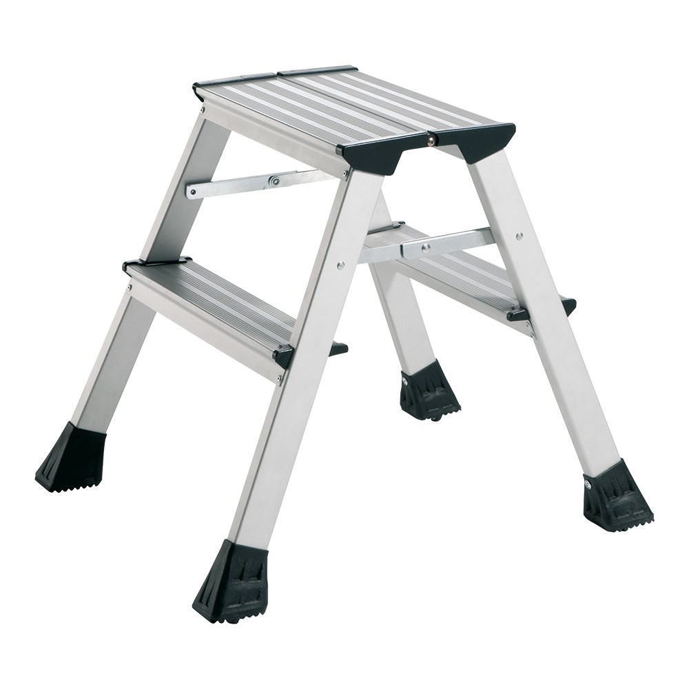 Aluminijske sklopive ljestve s jednom stepenicom i podestom. Rebraste protiv klizanja, plastični kutevi, okretni kotači 360* za lakše pomicanje koji se automatski uvlače pod opterećenjem.