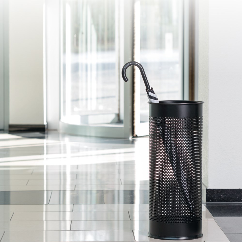 Vrlo kvalitetan i elegantan s ukrasnim perforiranim obodom. Napravljen od čelika i epoksidnog emajla, čime se osigurava čvrstoća i trajnost. Idealno za ulazne prostore, kod kuće, urede i trgovine.