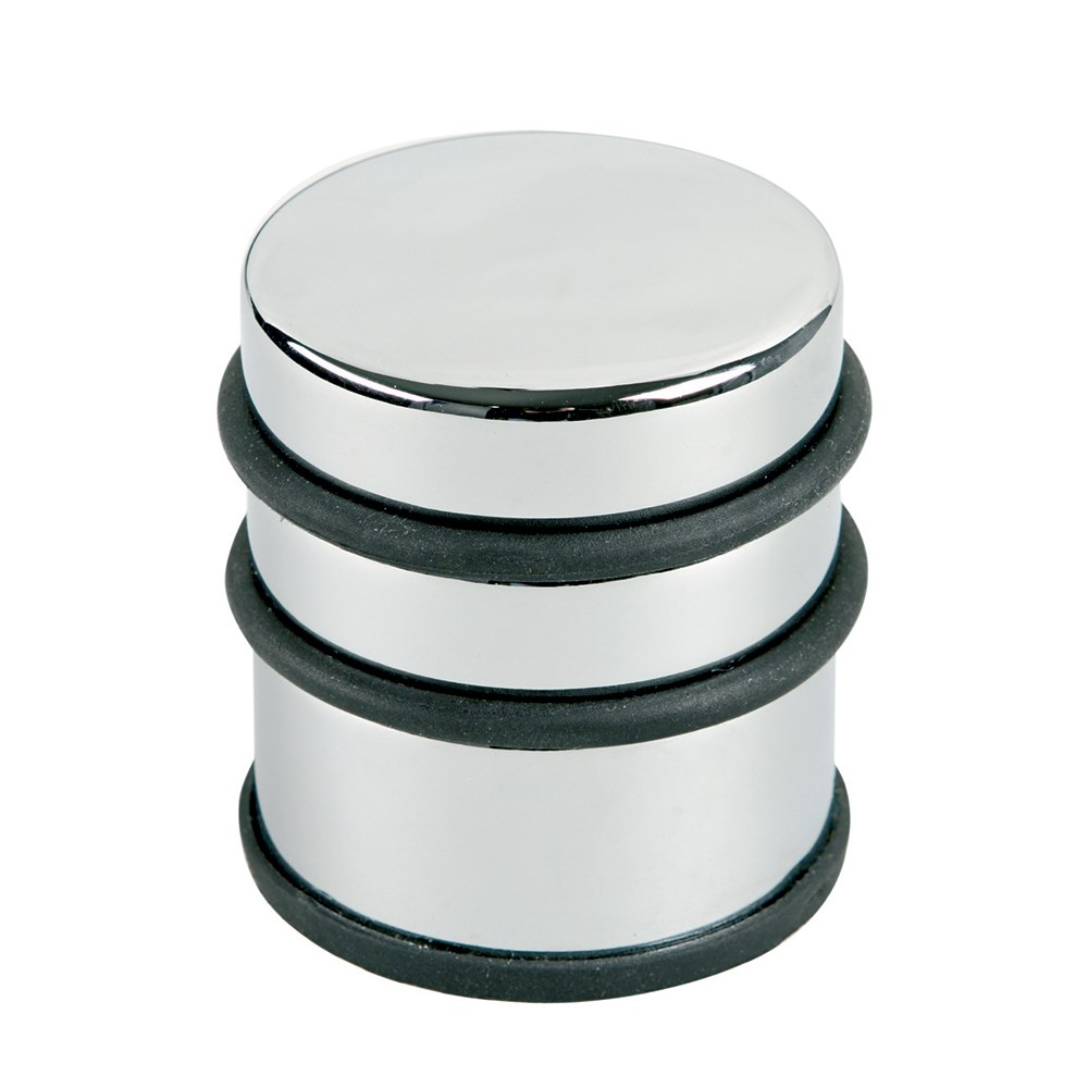 Metalni zaustavljač vrata s gumenom zaštitom. Promjer 6,5 cm, visina 7 cm, težina 1,3 kg.