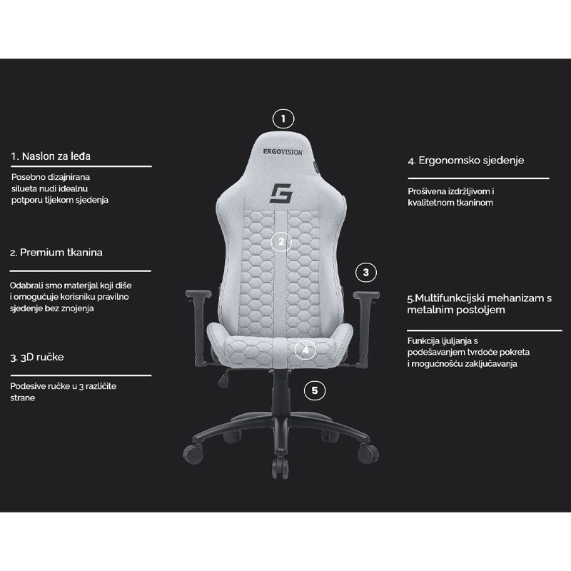 Gaming stolac modernog dizajna izrađena je od visokokvalitetne tkanine i ukrašena svijetlim šavovima koji stolici daju futuristički štih. Čvrsta podstava udobno grli tijelo i pruža pravu količinu podrške za duge sate igranja bez imalo osjećaja umora. Namijenjena je širokom spektru korisnika, visine od 150 do 185 cm i težine do 120 kg. Mogućnost porihtavanja visine, nagiba na izvanrednih 90° , zaključavanje u nekoliko položaja i funkcija ljuljanja. Priloženi jastuk za lumbalnu kralježnicu i glavu. Prilagodba ručki u 3 položaja.