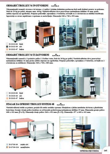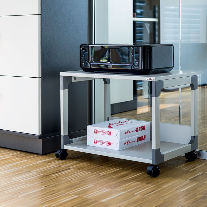 Visokokvalitetni stalak za printer, projekt ili ostalu uredsku opremu. Čvrst okvir izrađen od čelika otpornog na ogrebotine s plastičnim kutovima ojačanim staklenim vlaknima. Gornja i donja polica izrađene su od lesonita prekrivenog melaminom debljine 19 mm.