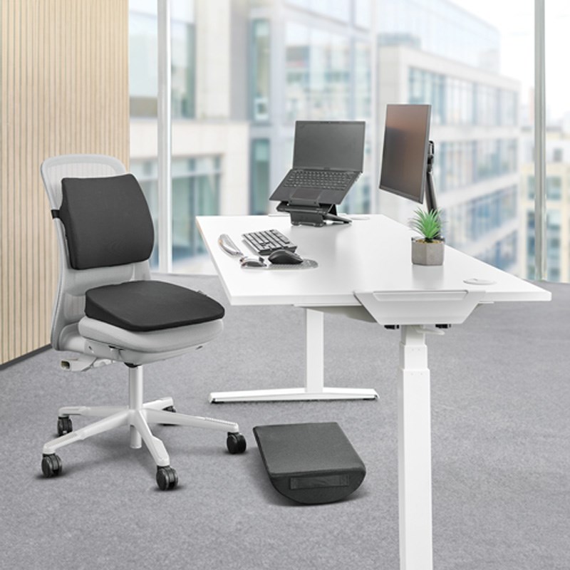 Fellowes Breyta™ odmarač za leđa pruža ključnu lumbalnu potporu koja običnu uredsku stolicu pretvara u ergonomsko sjedalo. Dizajnirana je da prati prirodnu zakrivljenost kralježnice, čime se smanjuje pritisak na donji dio leđa i sprječava napetost tijekom dugotrajnog sjedenja.