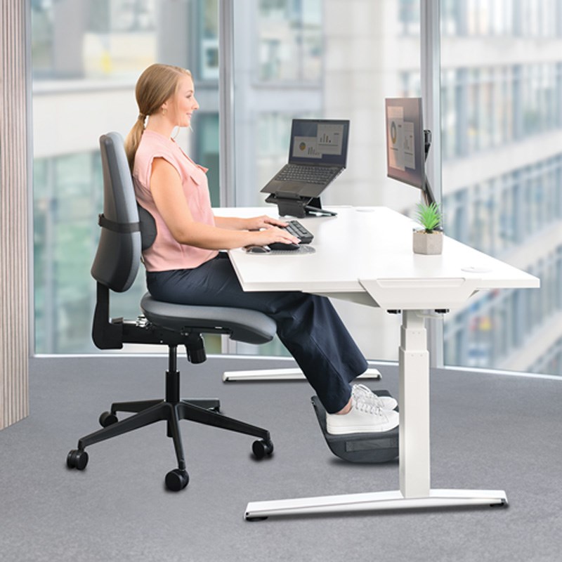 Fellowes Breyta™ odmarač s memorijskom pjenom pruža maksimalnu ergonomsku potporu prilagođavajući se jedinstvenom obliku vaših leđa. Memorijska pjena visoke gustoće reagira na toplinu i pritisak tijela, osiguravajući ravnomjernu podršku lumbalnom dijelu i trenutno olakšanje od napetosti uzrokovane dugotrajnim sjedenjem.