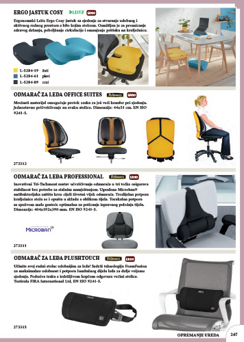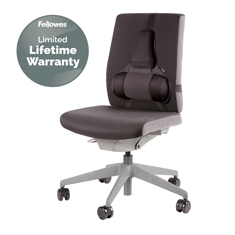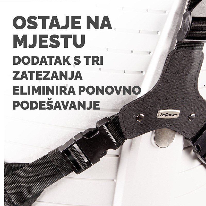 Inovativni Tri-Tachment sustav učvrščivanja odmarača u tri točke osigurava stabilnost bez potrebe za stalnim namještanjem. Ugrađena Microban® antibakterijska zaštita kroz cijeli životni vijek odmarača. Trodijelna potpora kralježnice steže se i opušta u skladu s oblikom tijela. Torakalna potpora sa spužvom male gustoće optimalna za poticanje ispravnog položaja tijela. Potpuno prilagodljiv većini uredskih stolaca. Jednostavna montaža: postavite odmarač na naslon stolice, prilagodite visinu i učvrstite remene.