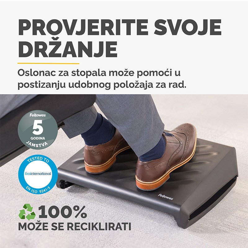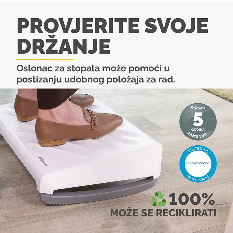 Inovativni odmarač za noge ima veliku, stabilnu platformu koja osigurava udoban položaj stopala. Nudi tri prilagodbe visine, uključujući opciju ljuljanja za povećanje kretanja i cirkulaciju. Elegantan i jednostavan dizajn dostupan u crnoj ili bijeloj boji.