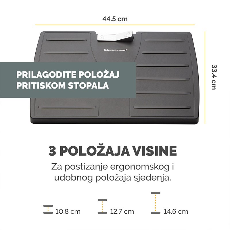 Veličina platforme: 44,4 x 33,3 cm, prilagodbe visine: 10,8 / 12,7 / 14,6 cm, stupanj nagiba: do 30°