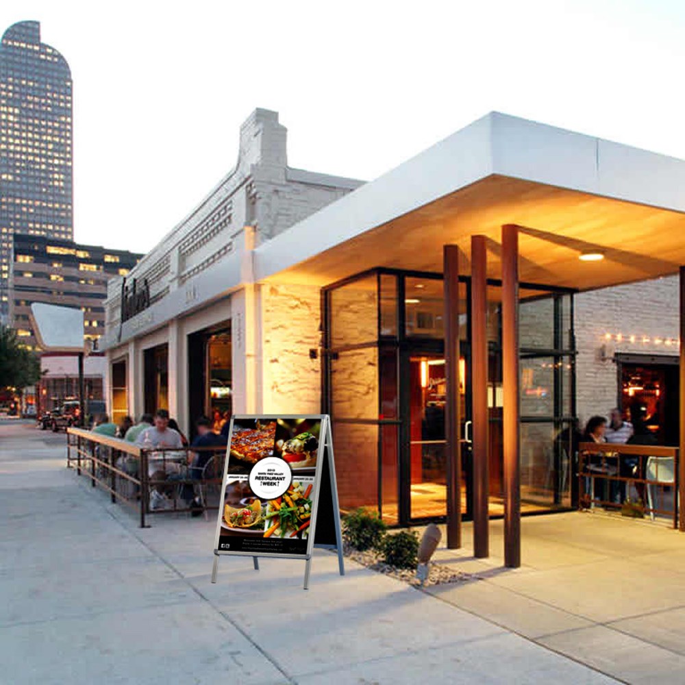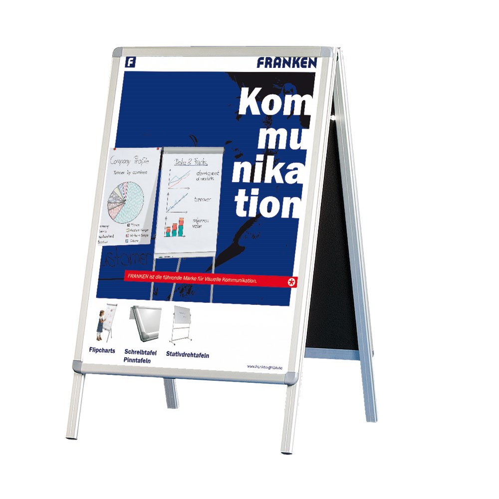 Samostojeći ulični dvostrani stalak za umetanje reklama. Aluminijski klik-klak okvir za laku promjenu sadržaja. Metalne noge, sklopiv, antirefleksni zaslon od folije s UV filterom. Otporan na vremenske prilike u normalnim uvjetima.