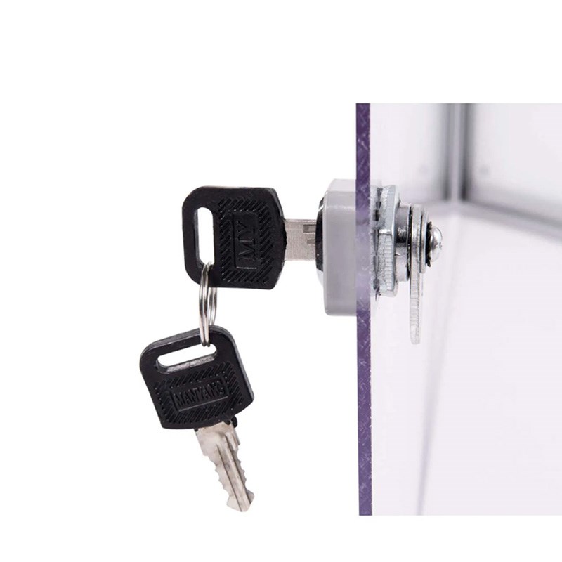 Okvir od srebrnog eloksiranog aluminija, bezokvirna plastično-staklena krilna vrata s integriranom bravom i 2 ključa.