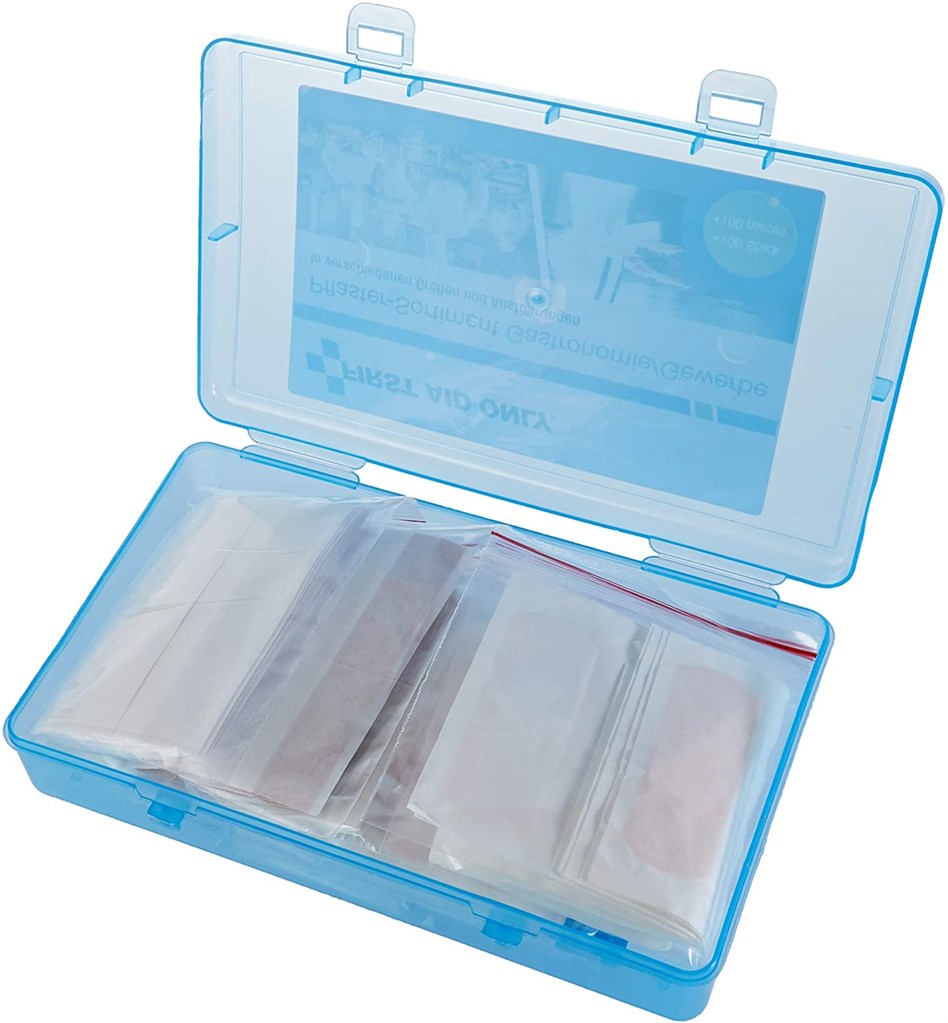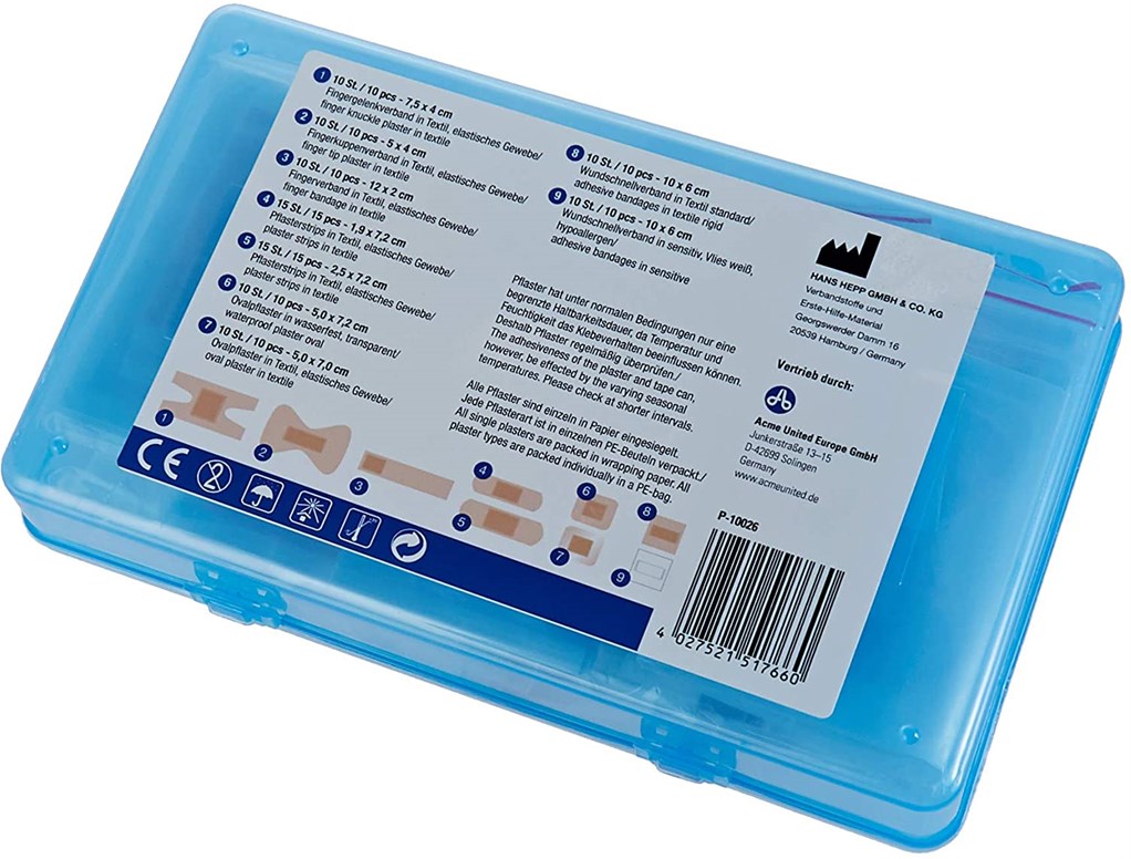 Praktična kutija s 100 različitih flastera za različite potrebe. Sadrži 10 flastera za zglobove prstiju, 10 flastera za vrhove prstiju, 10 flastera za prste, 15 malih flastera, 15 flastera, 10 vodonepropusnih ovalnih flastera, 10 ovalnih flastera, 10 zavoja za prvu pomoć, 10 osjetljivih zavoja za prvu pomoć. Praktično za lakše ozljede na radnom mjestu.