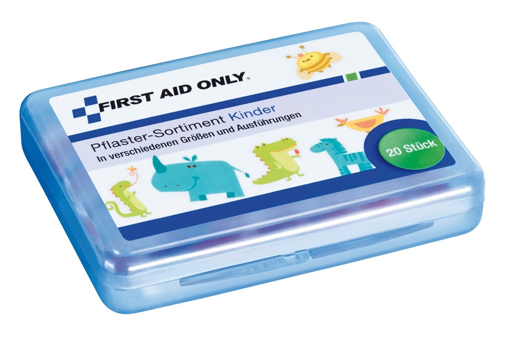 Praktična kutija s raznim flasterima dječjih uzorka. Sadrži 20 dječjih duguljastih flastera, te po 5 flastera u veličinama 6 x 10 cm, 1.9 x 7.2 cm, okrugle 2.5 cm i 1.9 x 7.2 cm Uključuje i škare za prvu pomoć. Mala kutija koja se može zatvoriti: dubina 9 cm, širina 11,5 cm, visina 2 cm, 65 g