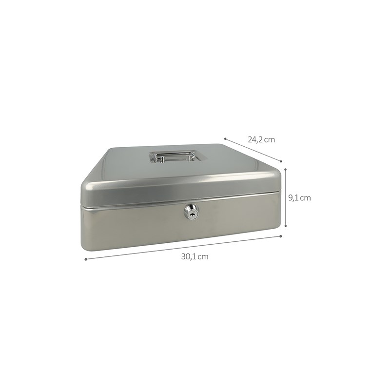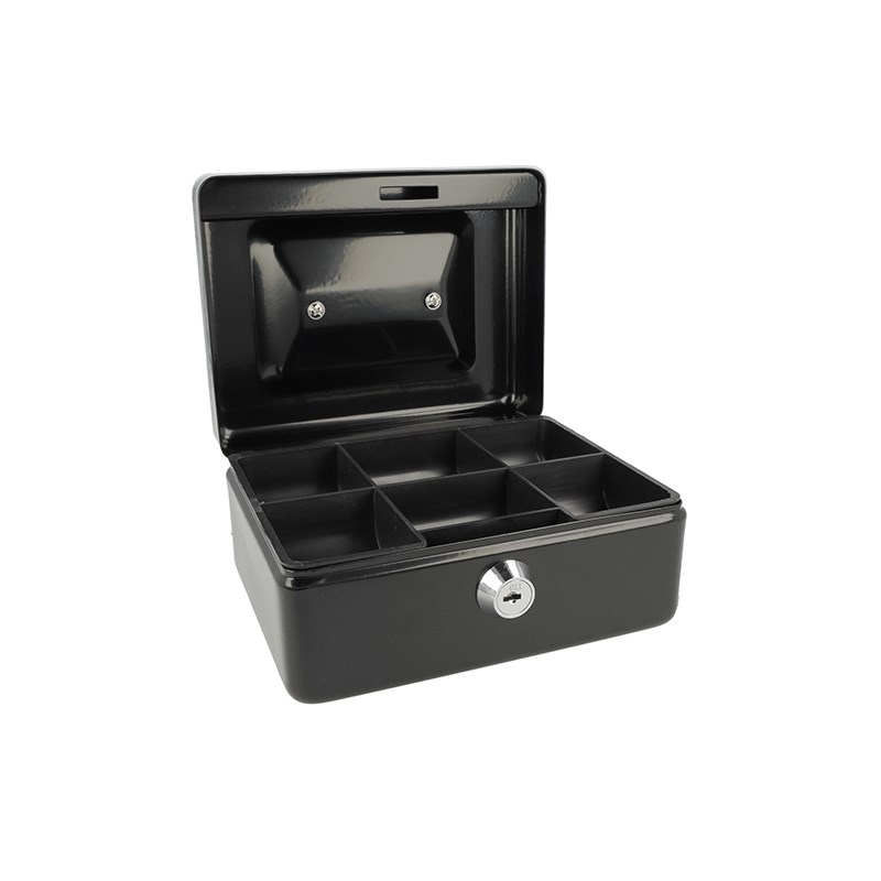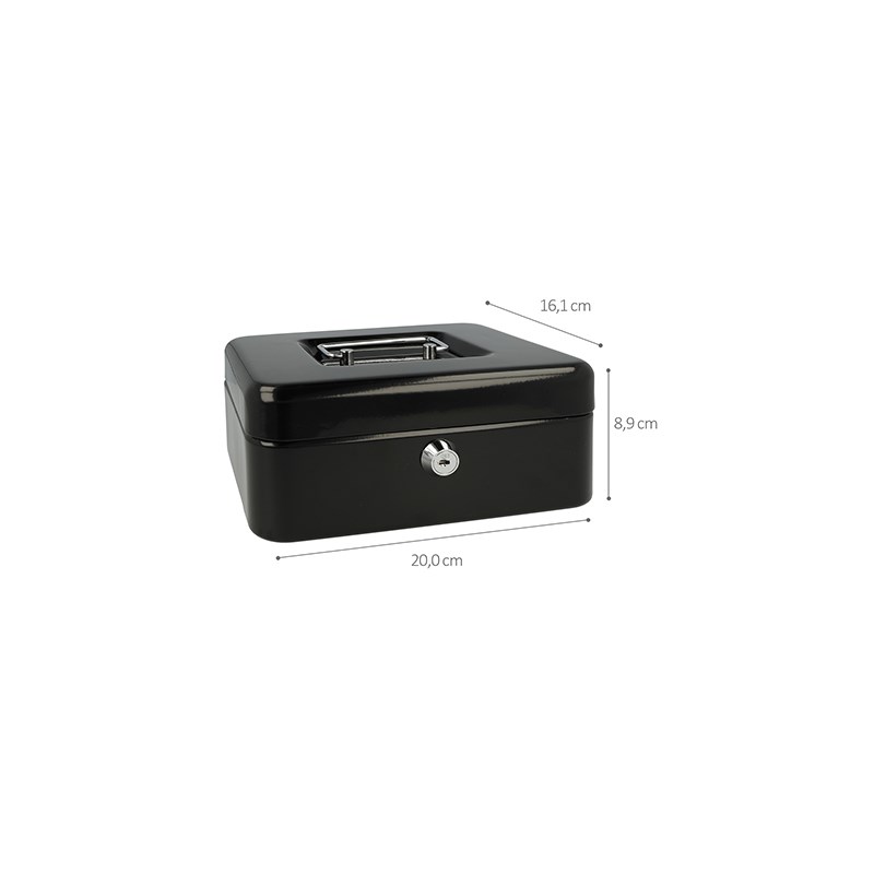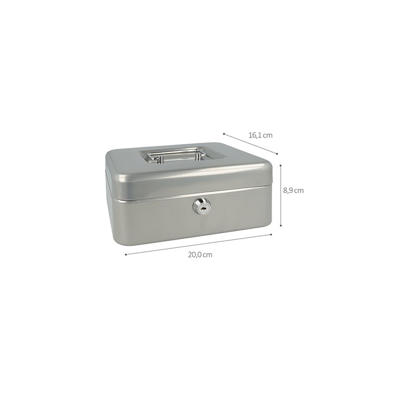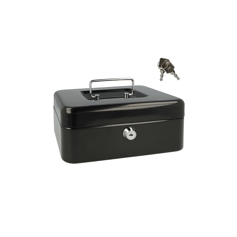 Metalna kasa za novac od obostrano lakiranog čelika. Kromirana brava s 2 ključa, plastični umetak za kovanice.