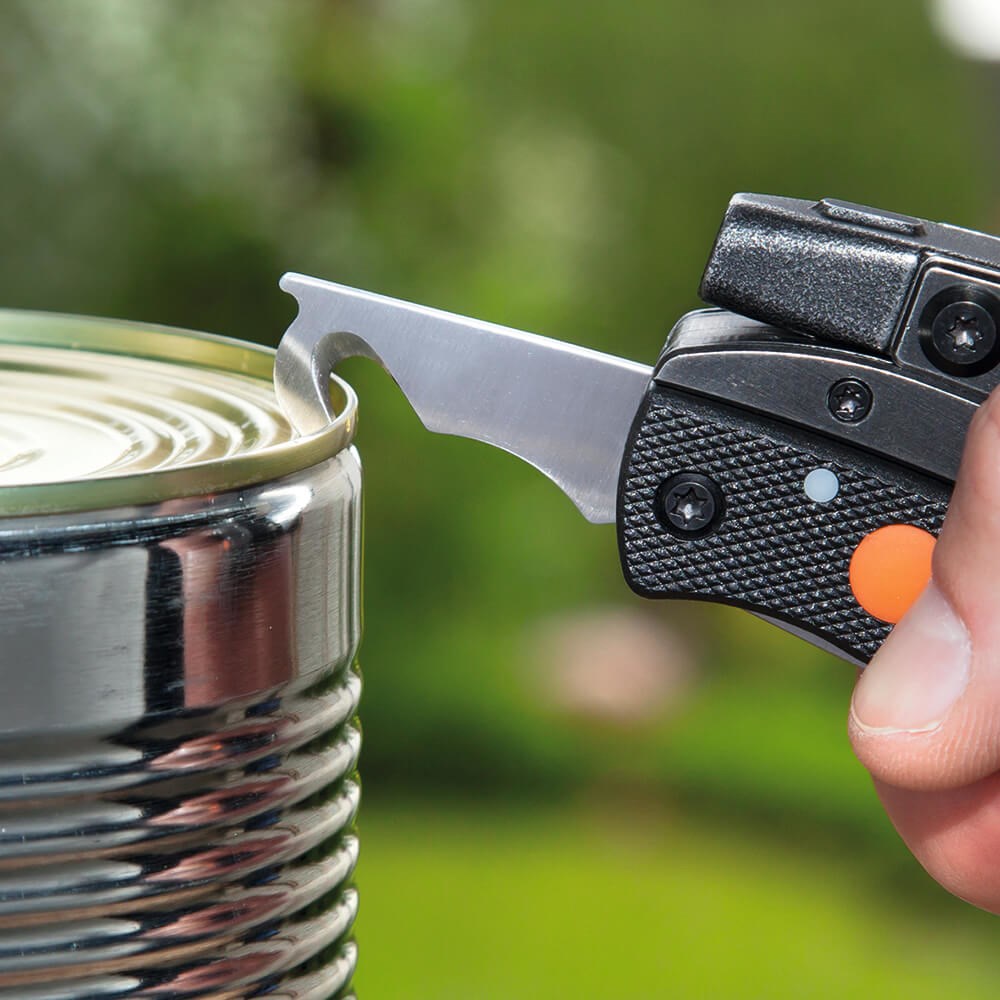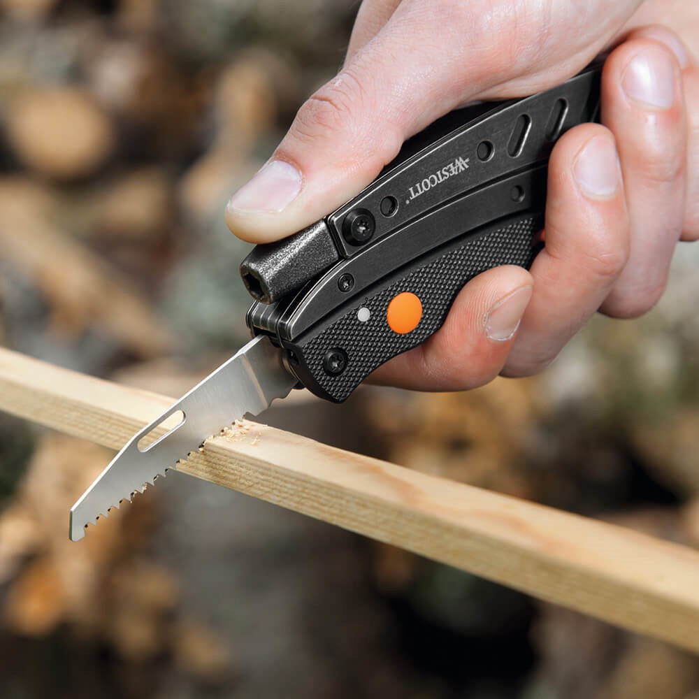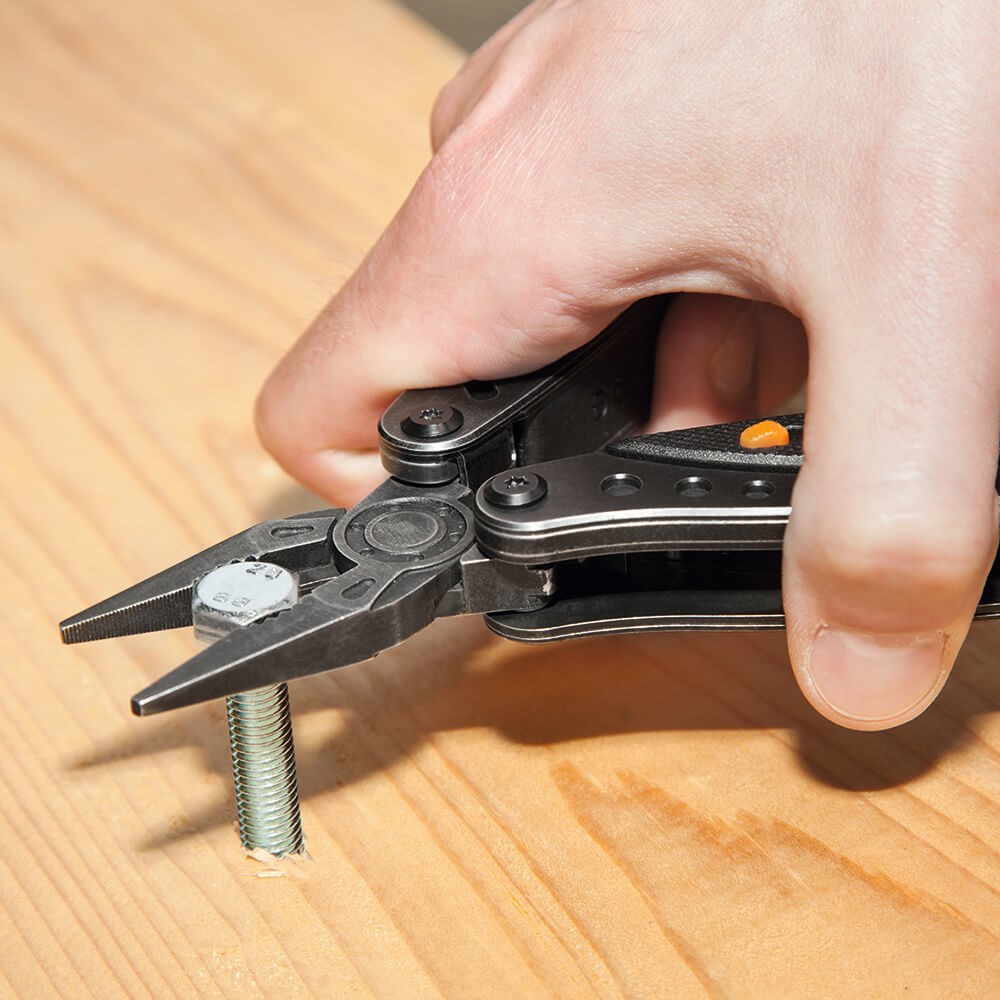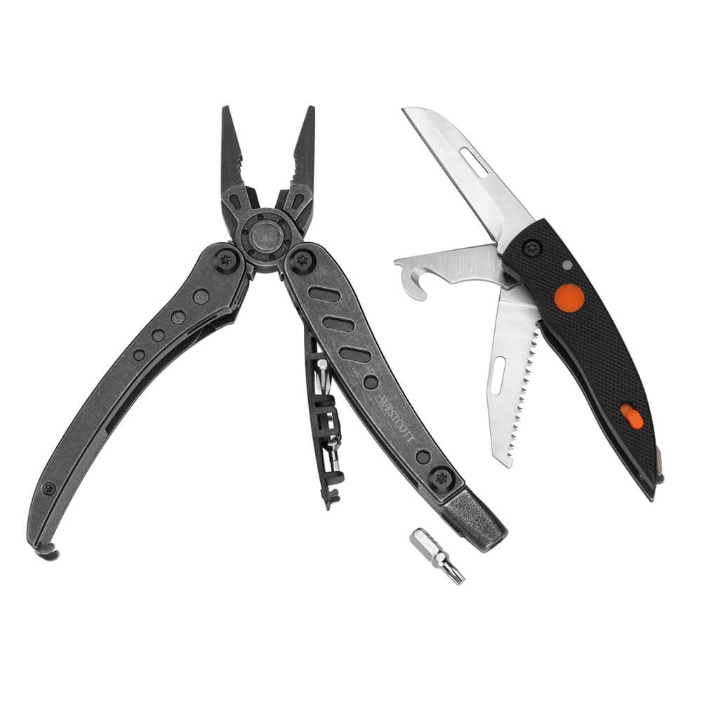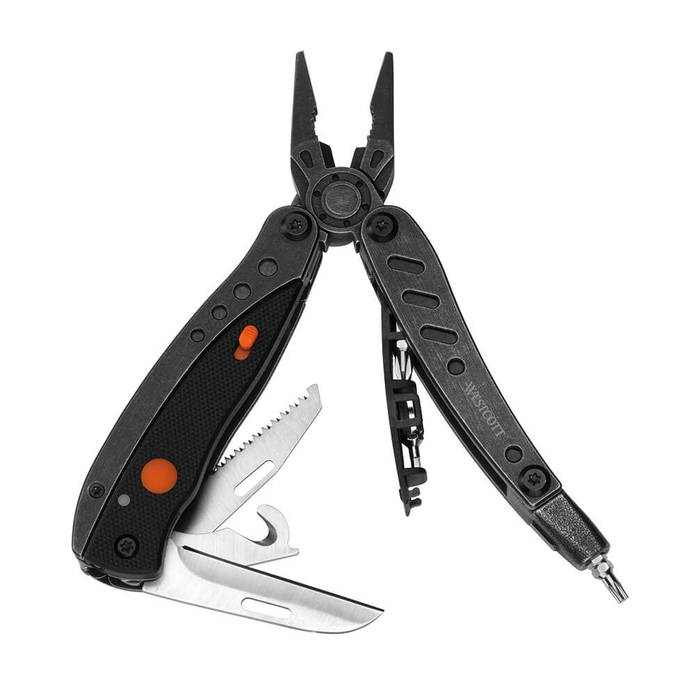 Džepni set alata od nehrđajućeg čelika i drškom od ABS-a. Sadrži: kliješta s unutarnjim oprugama, nož duljine 6 cm, pila duljine 6 cm, otvarač za boce, led svjetiljka, set odvijača: ravni, križni PH2, zvjezdasti T15, imbus 3mm. Najlon torbica.