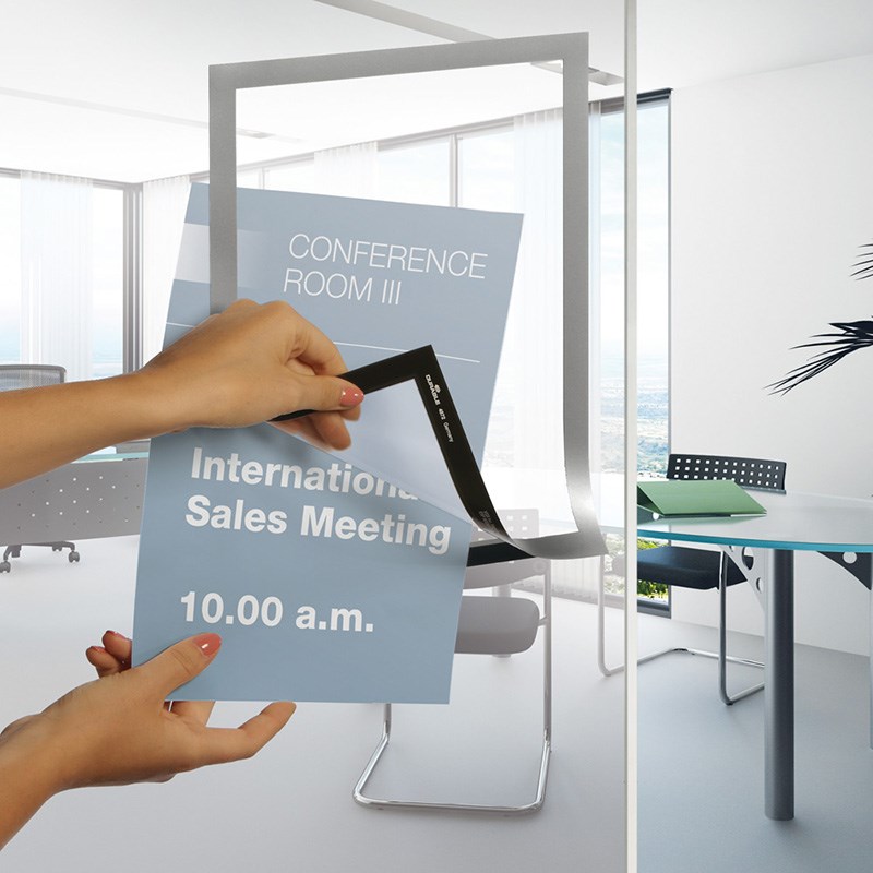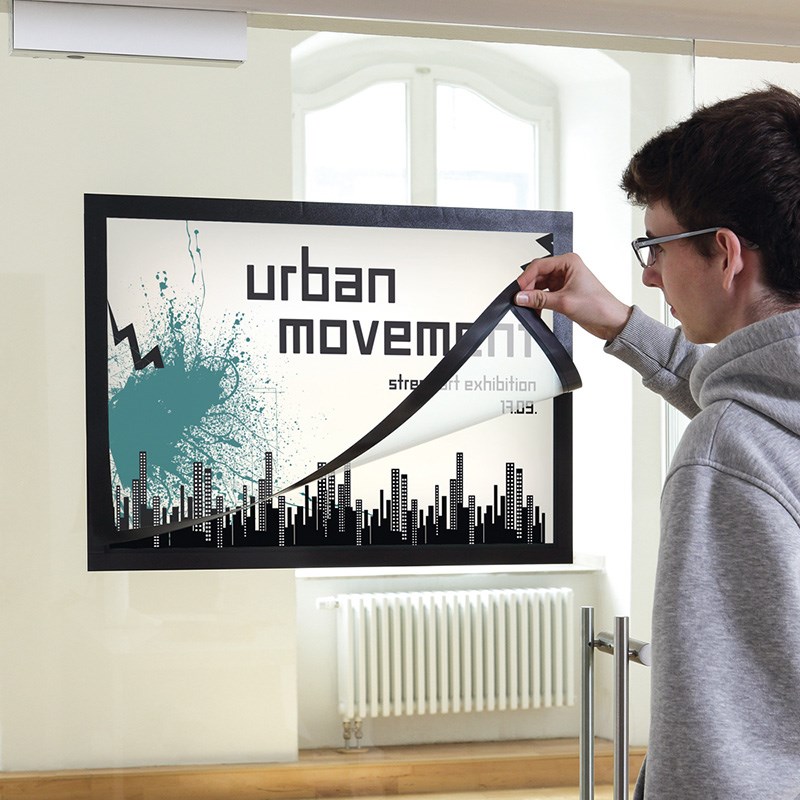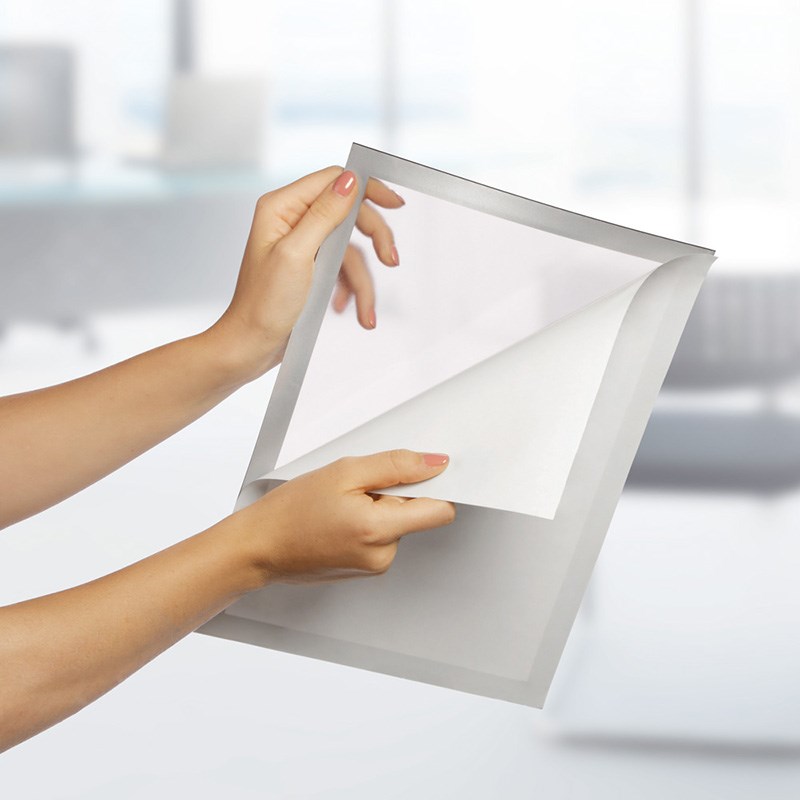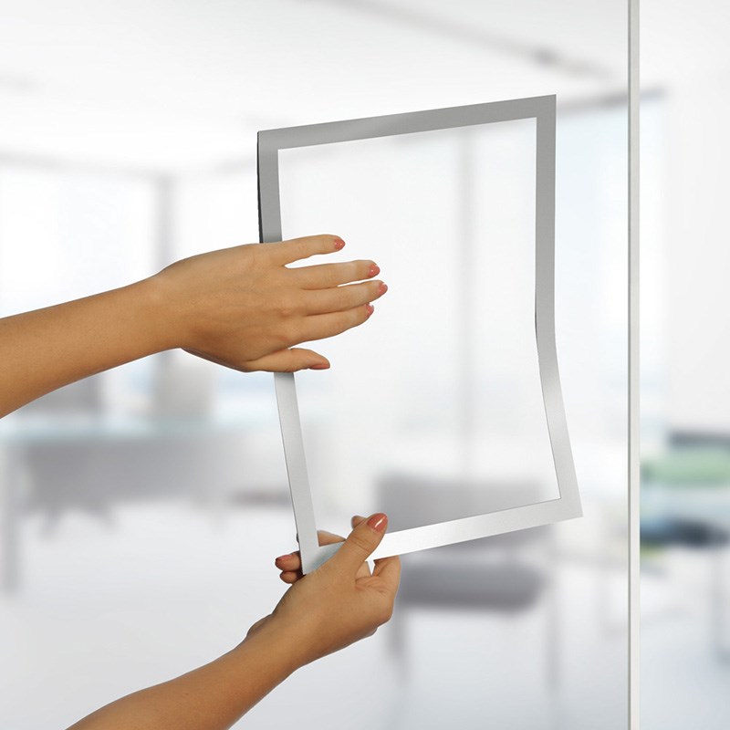 Prikažite svoje reklame ili informacije na elegantan način. Originalne DURAFRAME® samoljepljive okvire možete zalijepiti na bilo koju glatku površinu (ormar, zid, vrata, prozor,...) vodoravno ili okomito, a umetnuti materijal drži magnetni okvir sa središnjom prozirnom folijom prednjeg dijela okvira.