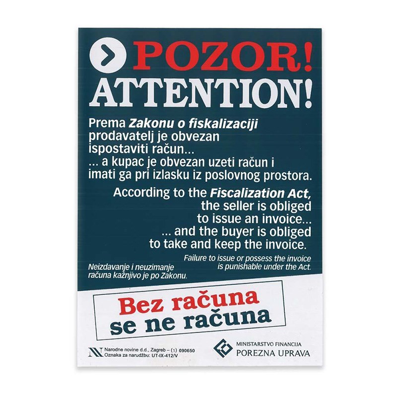 Prema Zakonu o fiskalizaciji obavezni ste na maloprodajno mjesto istaknuti naljepnicu "Pozor fiskalizacija".