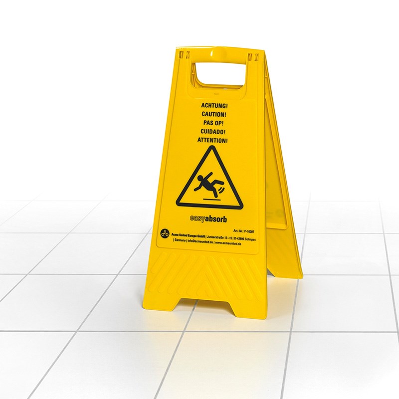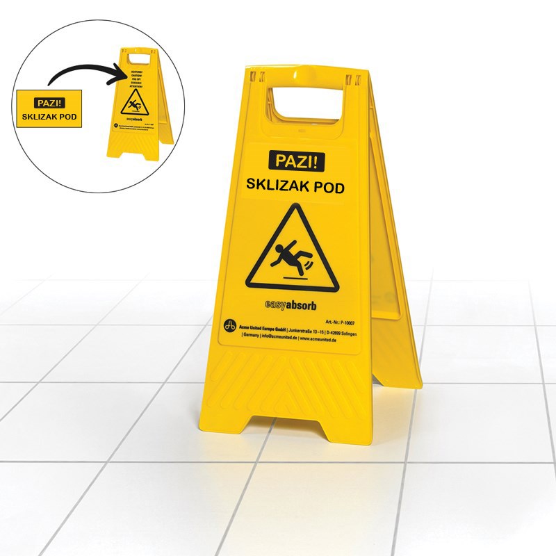 Sklopiva samostojeća oznaka sa simbolom "PAZI! SKLIZAK POD" i tekstom upozorenja na 5 svjetskih jezika. Izrađena od čvrste plastike. Postavlja se na pod te čini stalak u obliku slova A. Visina 61 cm.