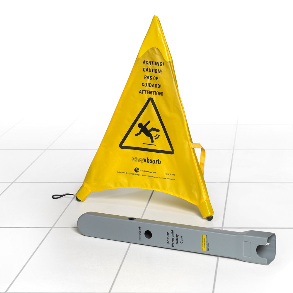 Samostojeća oznaka sa simbolom "sklizak pod". Izdržljiva konstrukcija i kvalitetan plašt s natpisom. Uključuje plastičnu kutiju za spremanje.