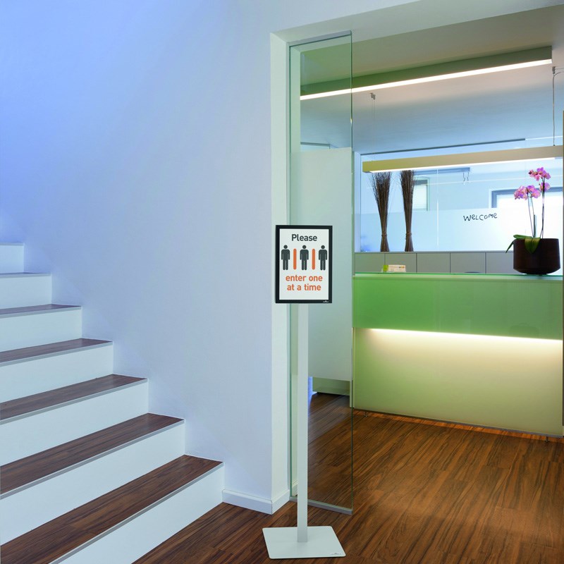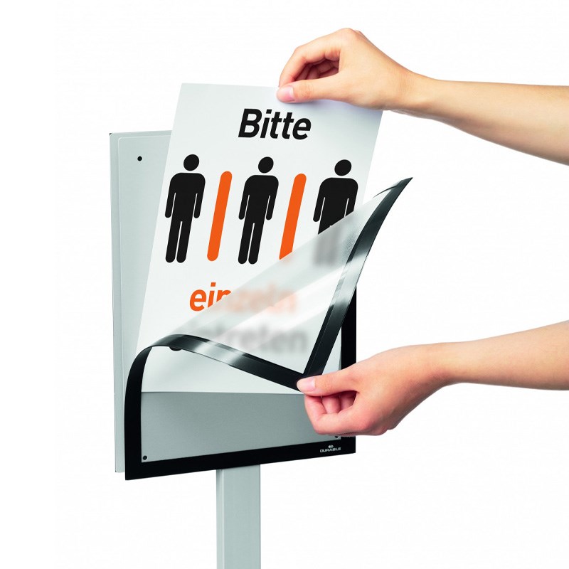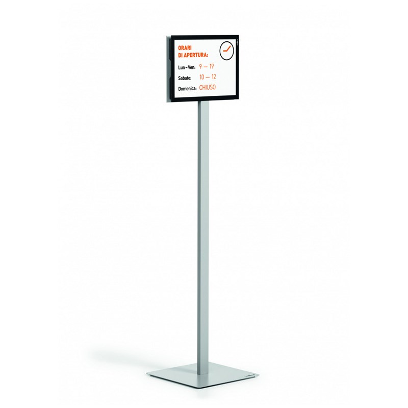Podni stalak s čitljivošću s obje strane. Prikladan za prikazivanje informacija, navođenje. Lagana promjena informacija zahvaljujući dvama magnetskim DURAFRAME ® MAGNETNIC info okvirima koji su pričvršćeni na metalne ploče. Visok stupanj stabilnosti zahvaljujući visokokvalitetnom potporni profil i teška podna ploča, s četiri gumene nožice. Jednostavno prebacivanje između portretnog i pejzažnog formata bez potrebe za alatima. Idealan za korištenje kao informacijski štand u recepcijama, na sajmovima, u predvorjima i u čekaonicama.