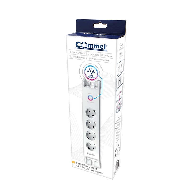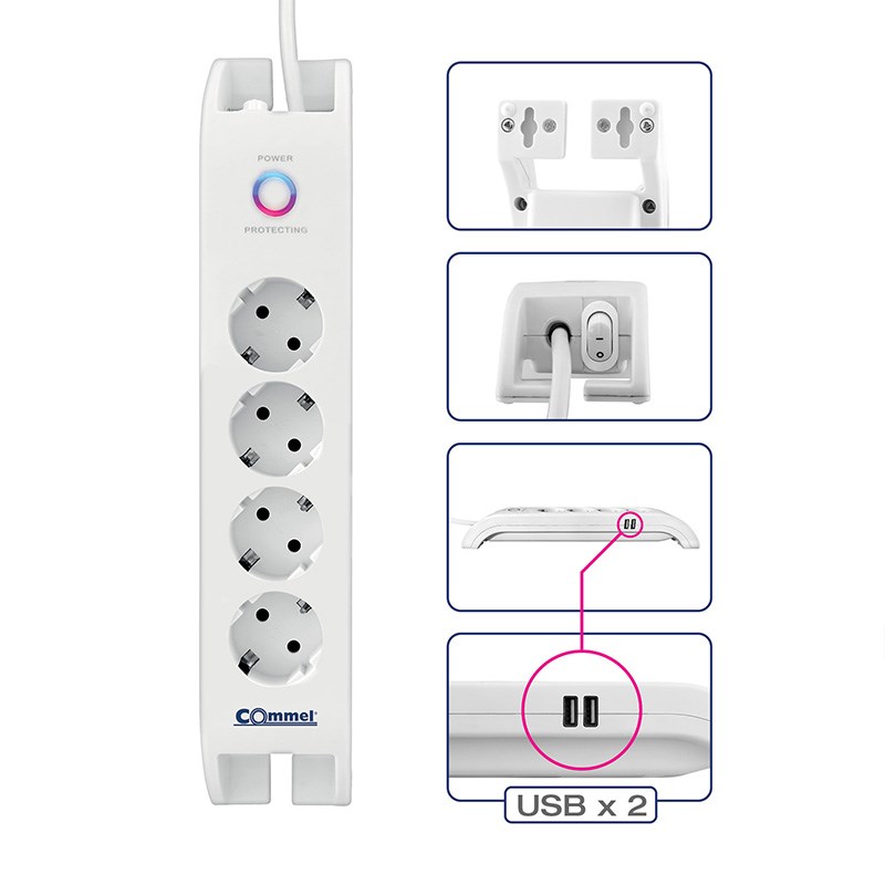Prenosivi produžni kabel s 4 utičnice + 2 USB i prekidačem te zaštitom od prenapona i preopterećenja 16A, 250V, 3500W.