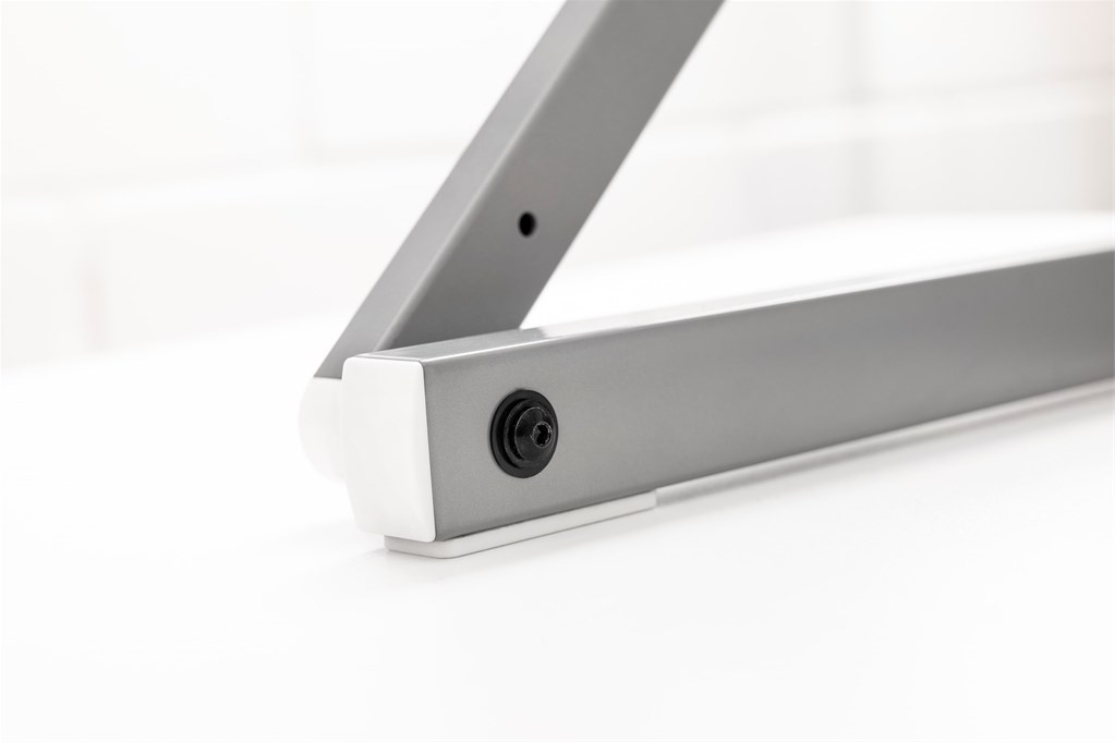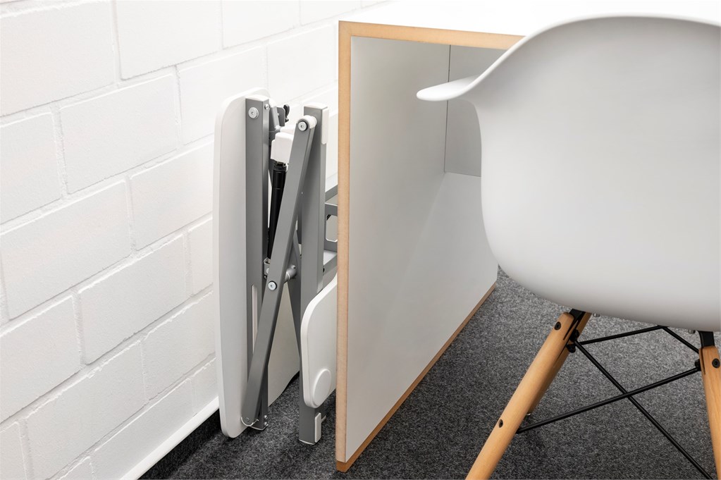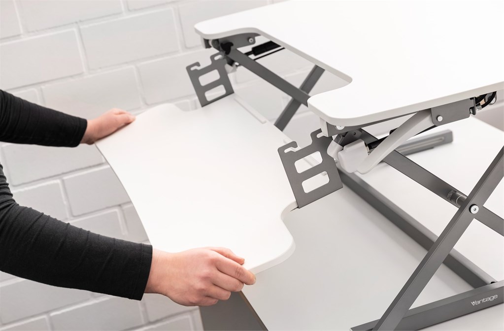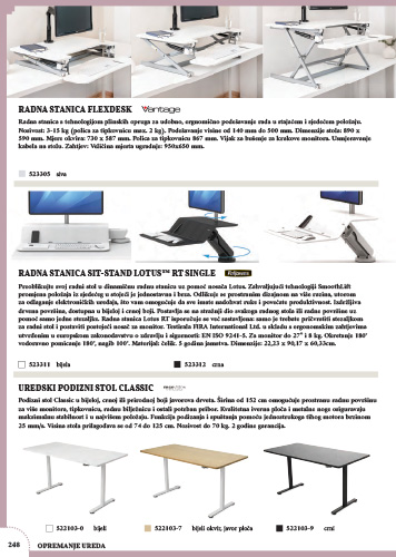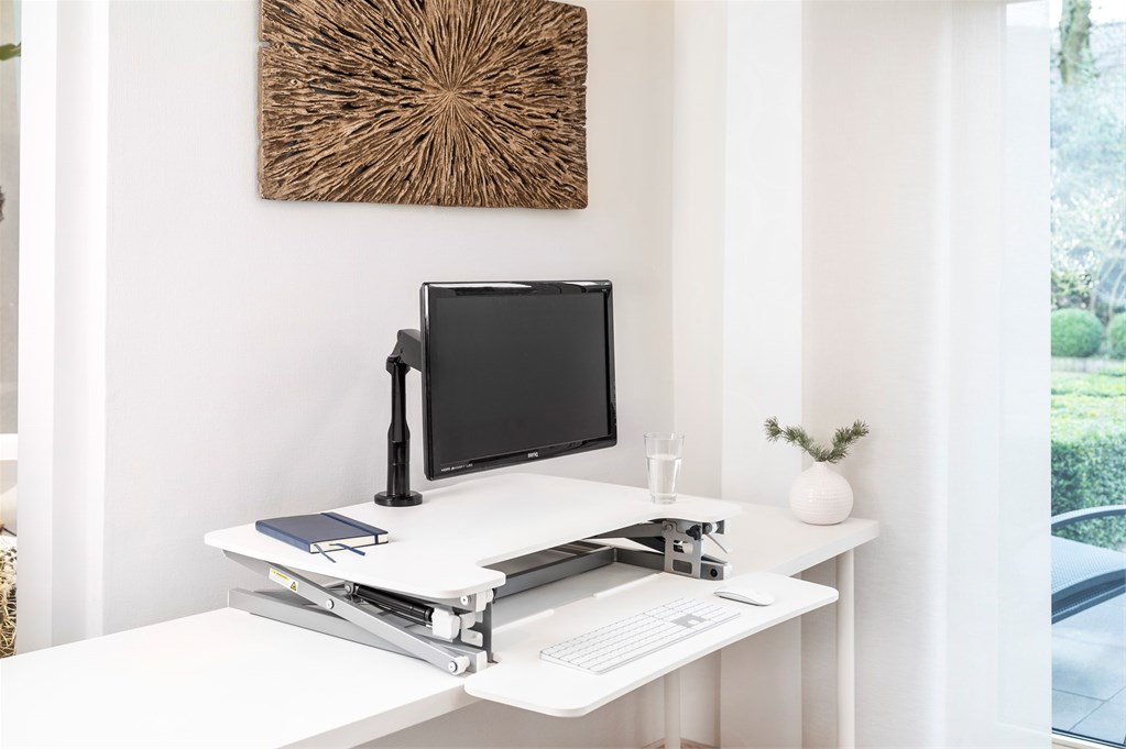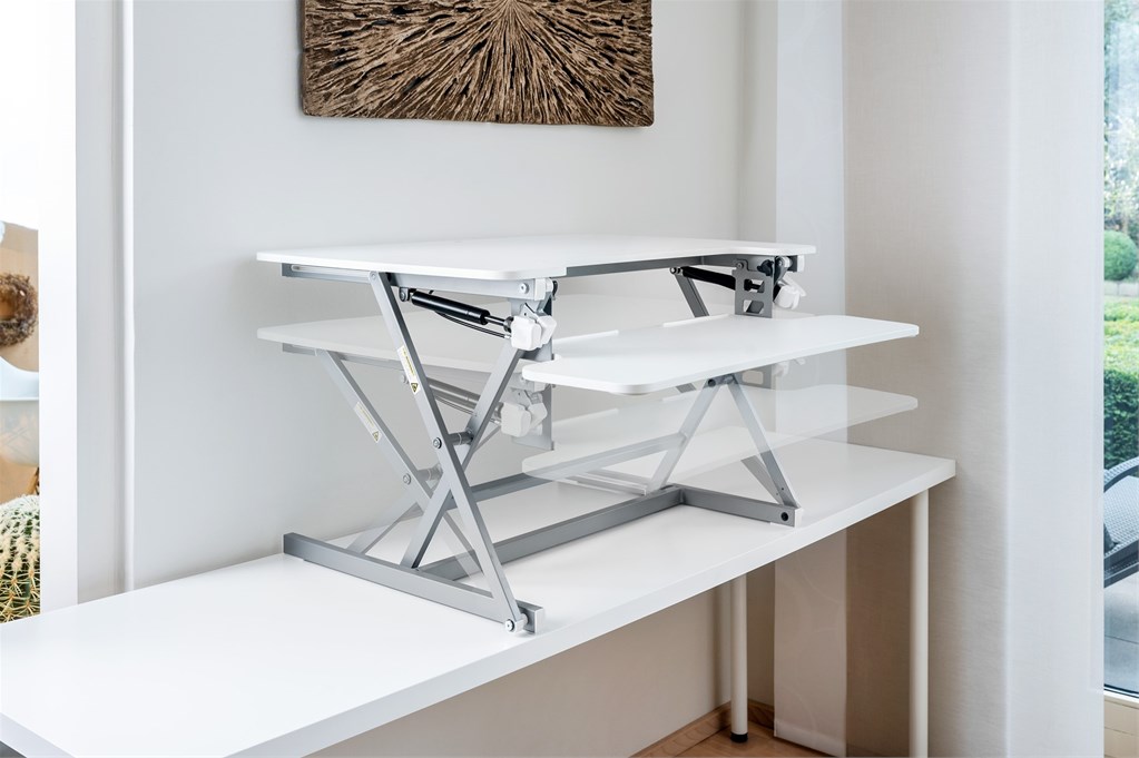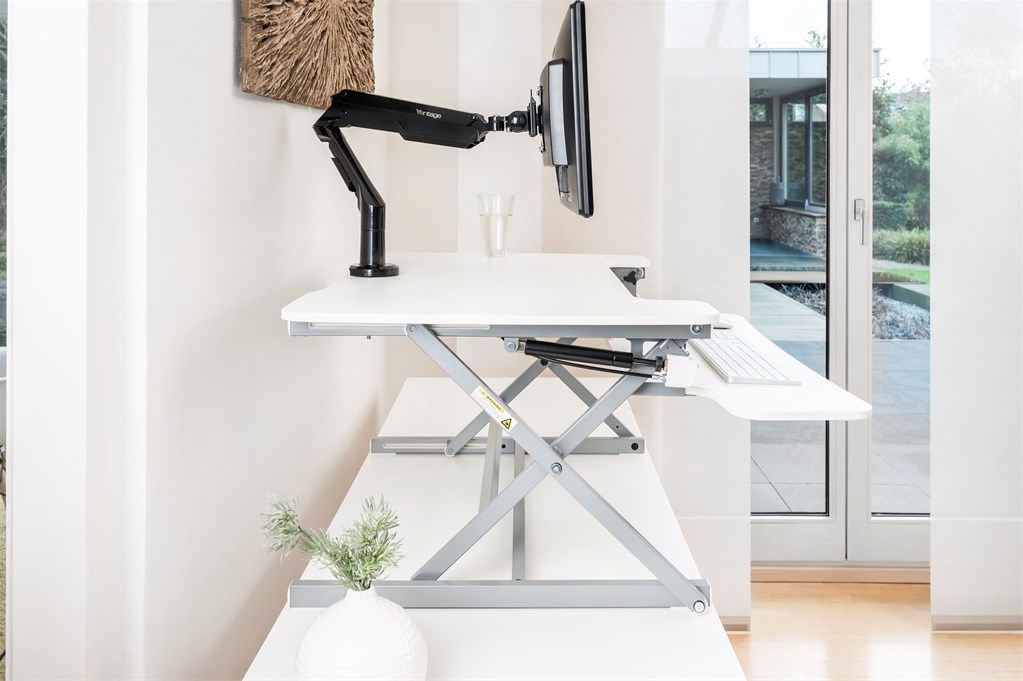 Radna stanica s tehnologijom plinskih opruga za udobno, ergnomično podešavanje rada u stajaćem i sjedećem položaju. Nosivost: 3-15 kg (polica za tipkovnicu max. 2 kg).