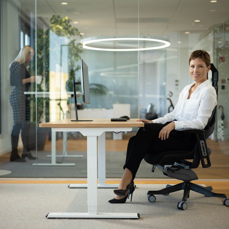 Podizni stol je izrađen od kvalitetne ploče iverice koja je na raspolaganju u bijeloj ili prirodnoj boji javorova drva. Prostrana radna površina dužine 160 cm pruža vam sav potreban prostor za monitore, računalo, tipkovnicu, bilješke i ostalo. Opremljen je dvostrukim motorom koji je nadasve tih te vam omogućava podizanje i spuštanje brzinom čak 35 mm/s. Mogućnost podešavanja 4 različite točke visine što omogućava brzo prelaženje između vaših najomiljenijih položaja za rad jednostavnim pritiskim na gumb. Ugrađena štoperica koja podsjeća kad je vrijeme za promjenu položaja. Sigurnosna funkcija protiv sudara s predmetima prilikom spuštanja (npr. s uredskim stolcem). Metalni nosivi stupovi osiguravaju maksimalnu stabilnost i u najvišem položaju, a nosivost stola je čak 100 kg. Stol možete podesiti na visinu od 64,5 do 130 cm.
