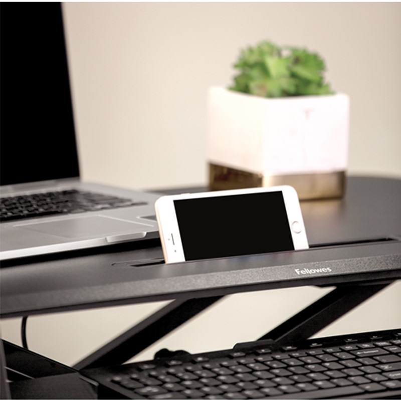 Pretvorite svoj sjedeći stol u dinamičnu radnu stanicu i dodajte pokret svom radnom danu kako biste ostali aktivni i zdravi. Pokretna radna stanica omogućuje vam da jednostavno prijeđete iz sjedećeg u stojeći položaj pomoću podešavanja visine plinske opruge. Velika radna površina omogućuje fleksibilno postavljanje, držeći dva monitora ili monitor i prijenosno računalo. Umetak za telefon ili druge dodatne dodatke.