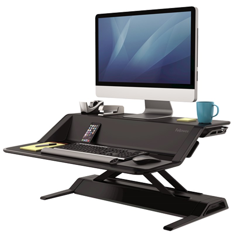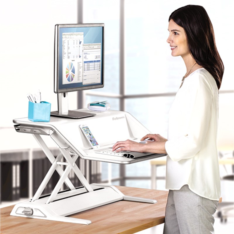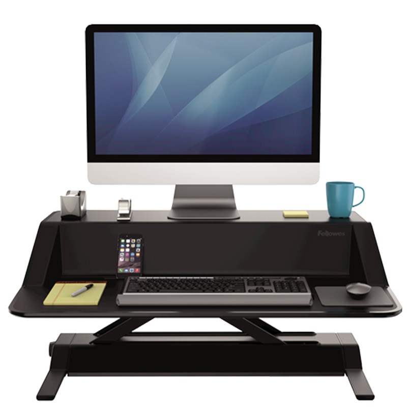 Radna stanica Sit-Stand Lotus™ postavlja se na radni stol i može se jednostavno podignuti do 43 cm uz pomoć tehnologije SmoothLift™ i dviju udobnih ergonomskih ručki, tako da možete raditi sjedeći ili stojeći. Mogućnost postavljanja visine u 22 položaja uz zadržavanje savršene stabilnosti i nosivosti do 18 kg. Prostrana radna površina na dvije razine omogućuje dobru organizaciju uz zadržavanje sve neophodne opreme za radni stol, uključujući tipkovnicu i miša koji možete postaviti s lijeve i ili desne strane. Radna stanica opremljena je sustavom za vođenje kabela i odjeljcima za držanje i punjenje električnih uređaja. Na gornju razinu radne stanice možete postaviti monitor sa stalkom ili možete zatražiti dvostruki (523309) ili jednostruki (523308) nosač monitora. Radna stanica isporučuje se sastavljena, samo je postavite na radni stol i spremna je za upotrebu.