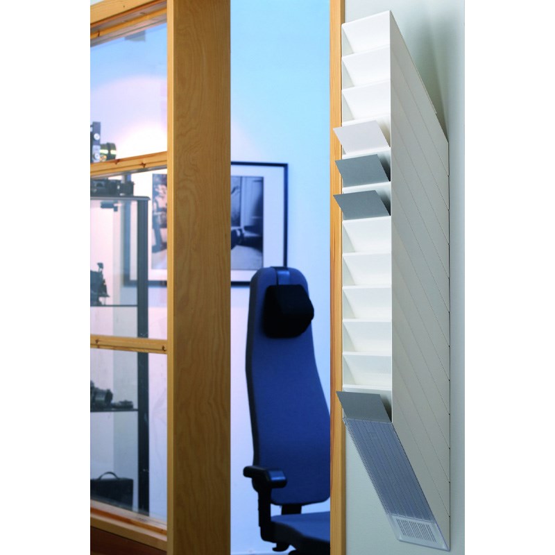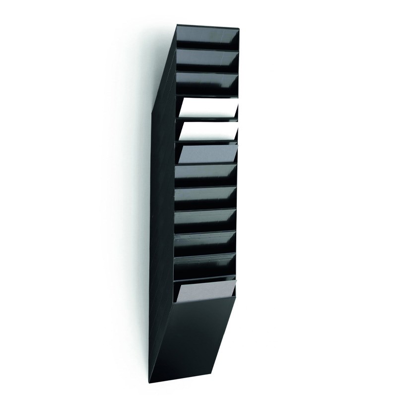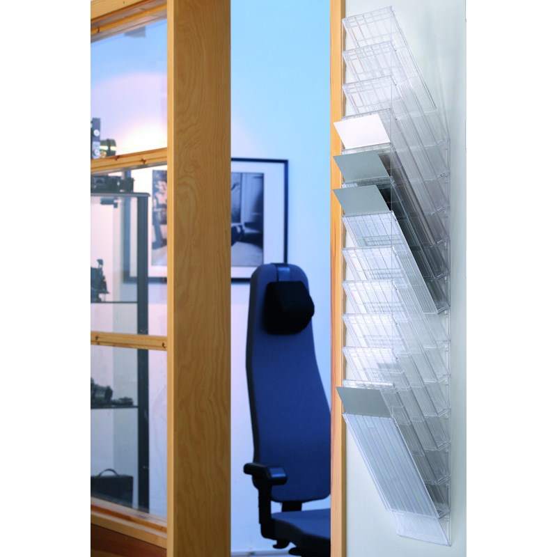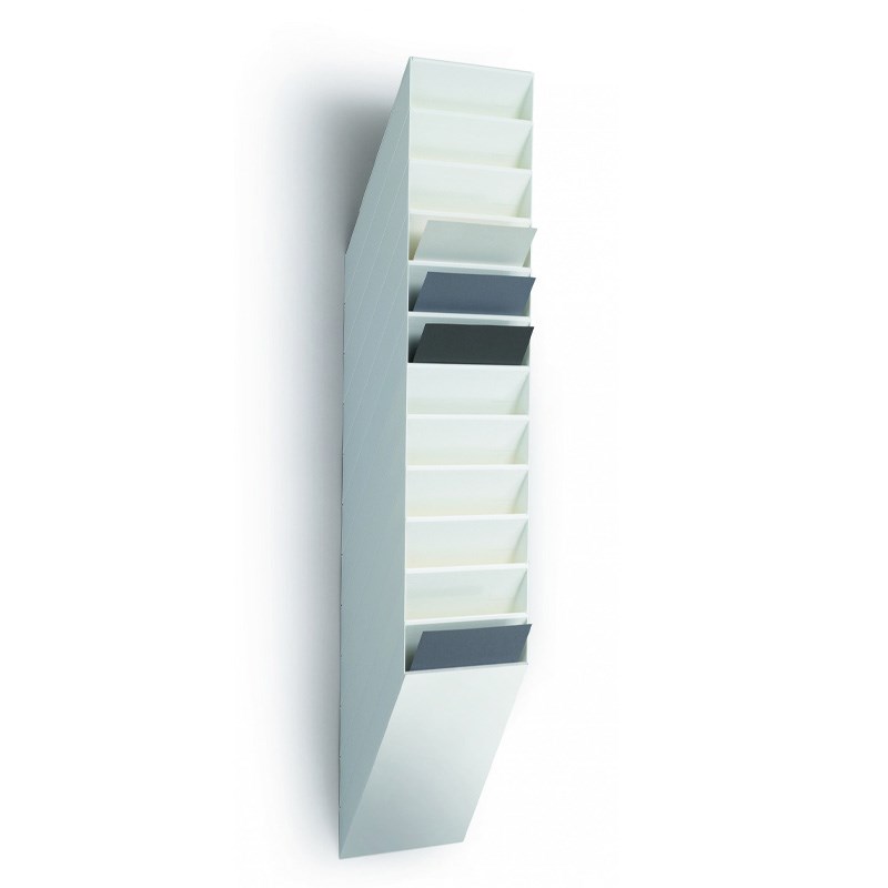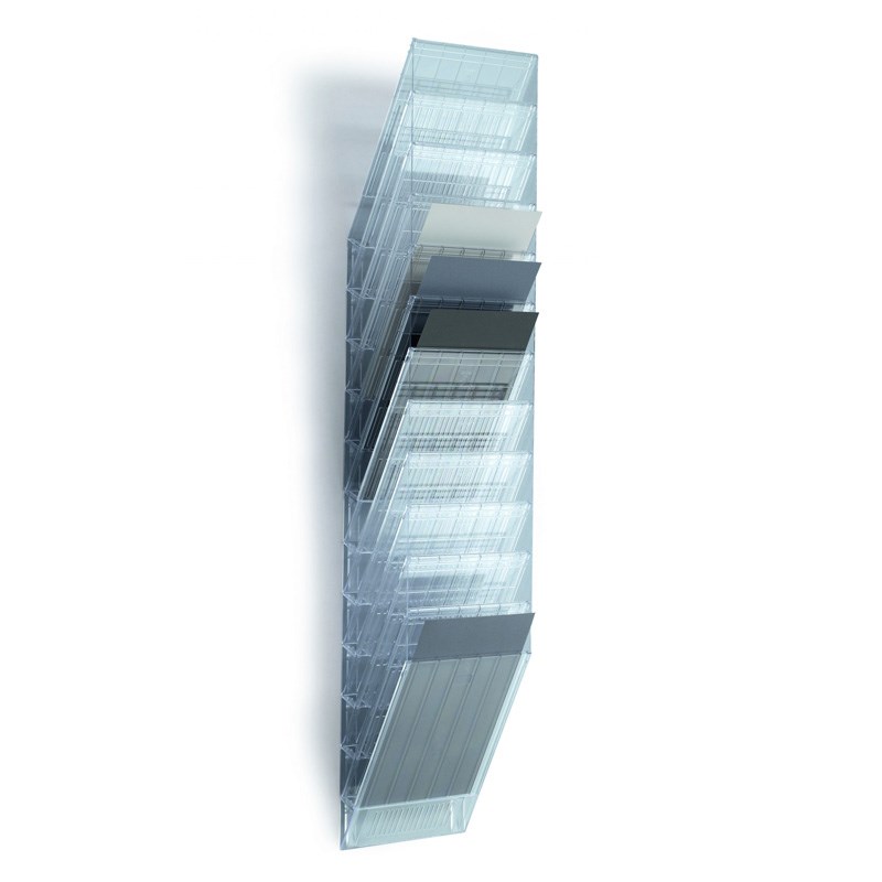 Zidni stalak sa 12 vertikalnih odjeljaka za odlaganje ili sortiranje dokumenata i prospekata formata A4. Idealno za radione, pogone, recepcije, čekaonice, sajmove, prezentacijske dvorane, itd.