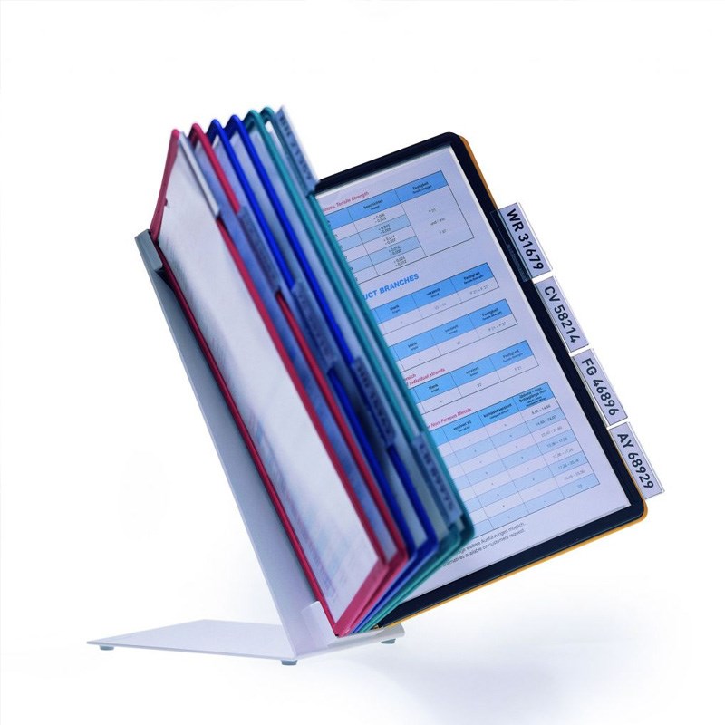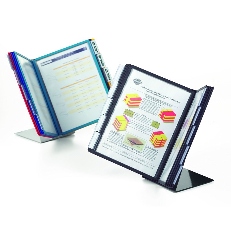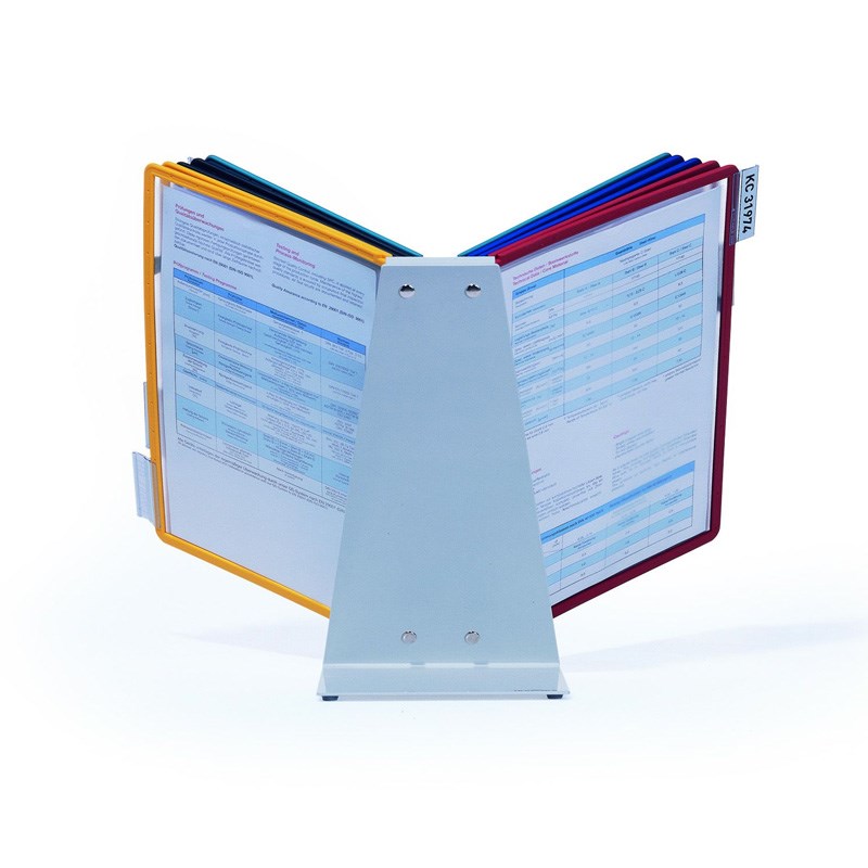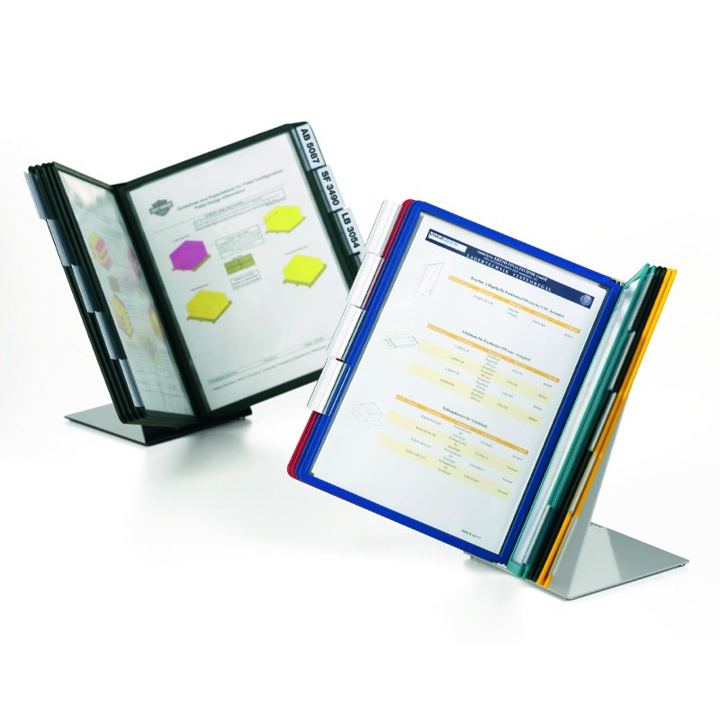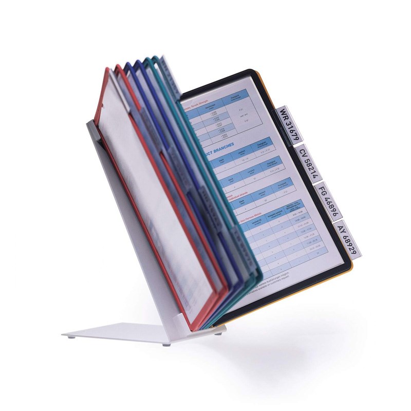 Stolni stalak s 10 SHERPA preglednih mapa u A4 formatu. Robustan stolni stalak izrađen od čeličnog lima obloženog zapečenim prahom, L-oblika za dodatnu stabilnost s polipropilenskim preglednim mapama s profilnim okvirom u boji i filmom niske refleksije prikladnim za skeniranje. Uključeni jahači za označavanje preglednih mapa.