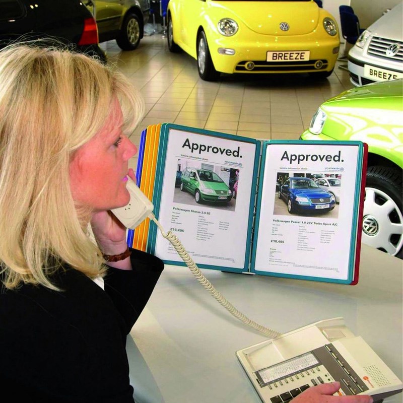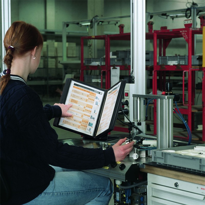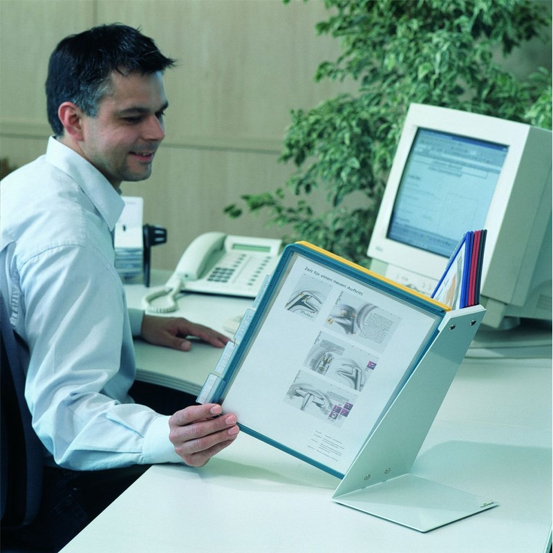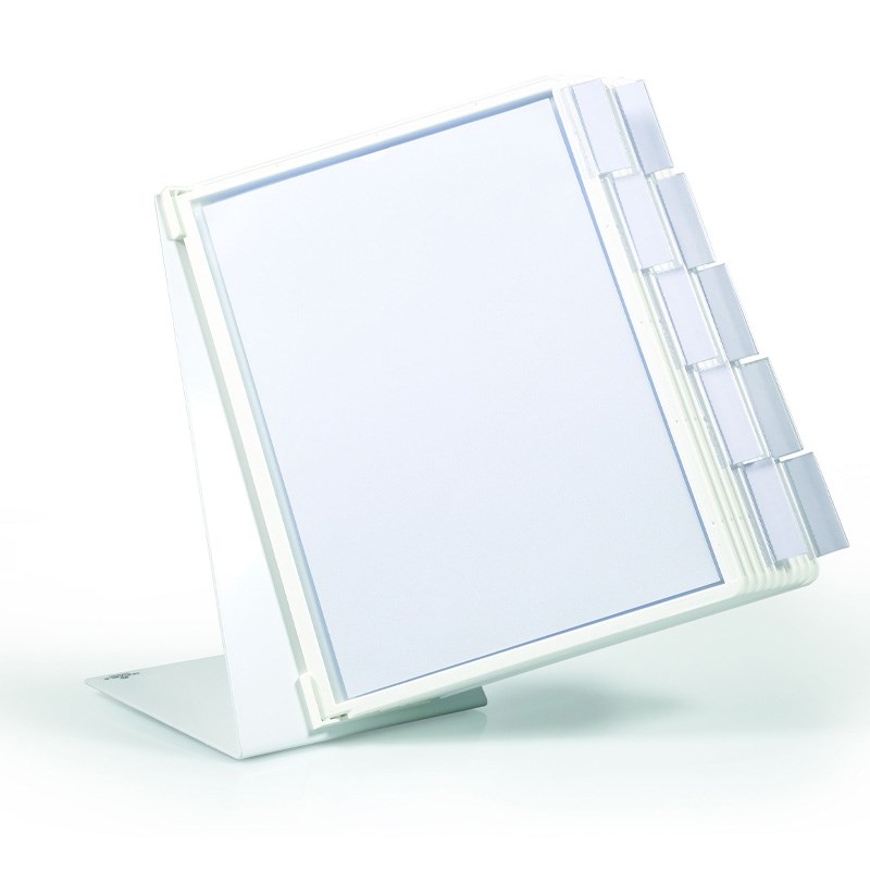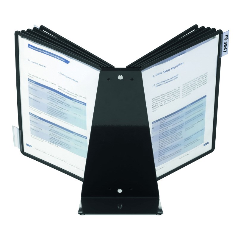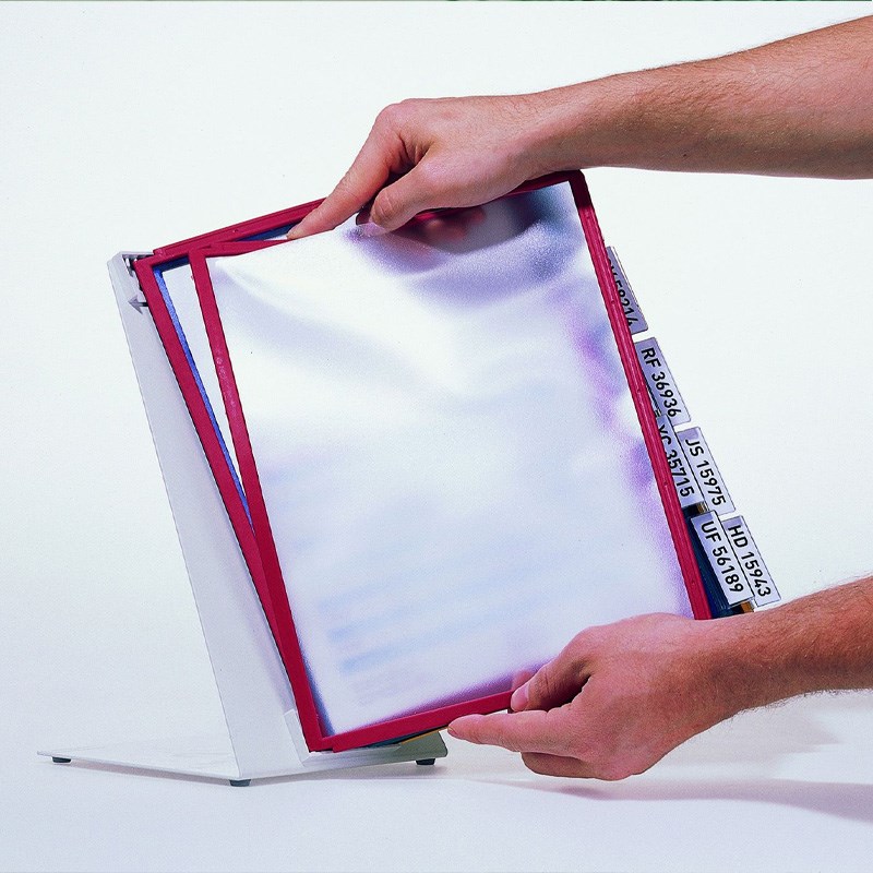 Stolni stalak s 10 SHERPA preglednih mapa u A4 formatu. Robustan stolni stalak izrađen od čeličnog lima obloženog zapečenim prahom, L-oblika za dodatnu stabilnost s polipropilenskim preglednim mapama s profilnim okvirom u boji i filmom niske refleksije prikladnim za skeniranje. Uključeni jahači za označavanje preglednih mapa.