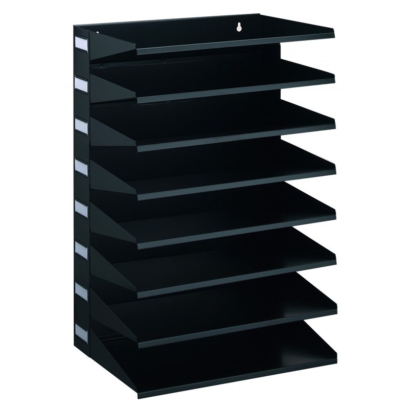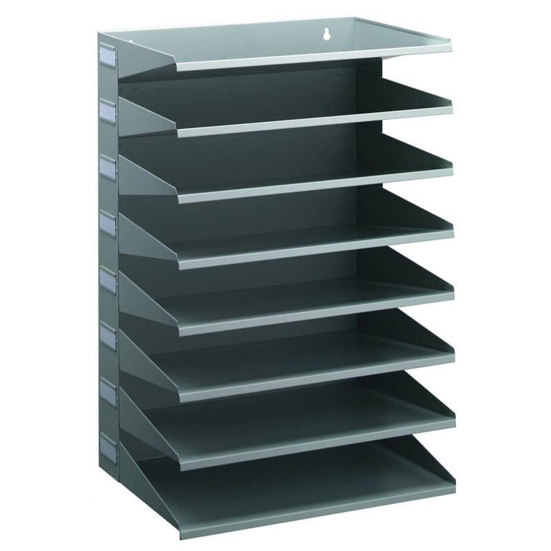 Metalna polica s 8 odjeljaka za sortiranje papira A4, index sadržaja bočno. Pomaže pri organizaciji i klasifikaciji dokumenata. Pogodan za ugradnju na zid.