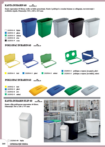 Kante zapremine 60 litara, ručke za lakše prenošenje. Kante i poklopci u raznim bojama za odlaganje, razvrstavanje i reciklažu otpada.