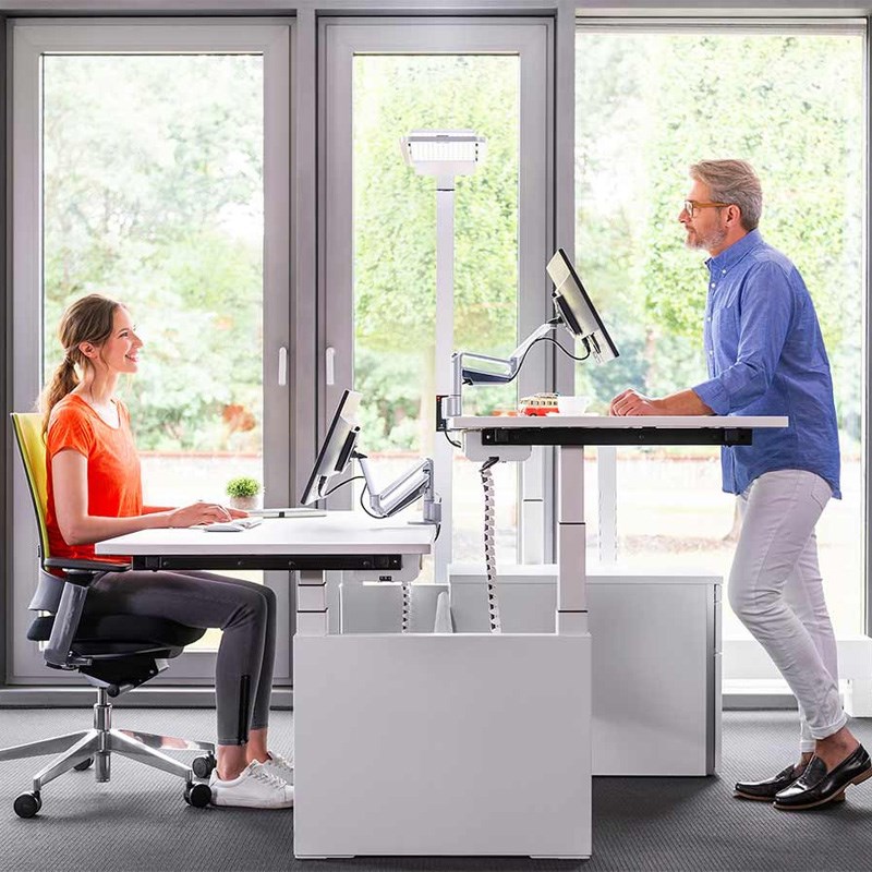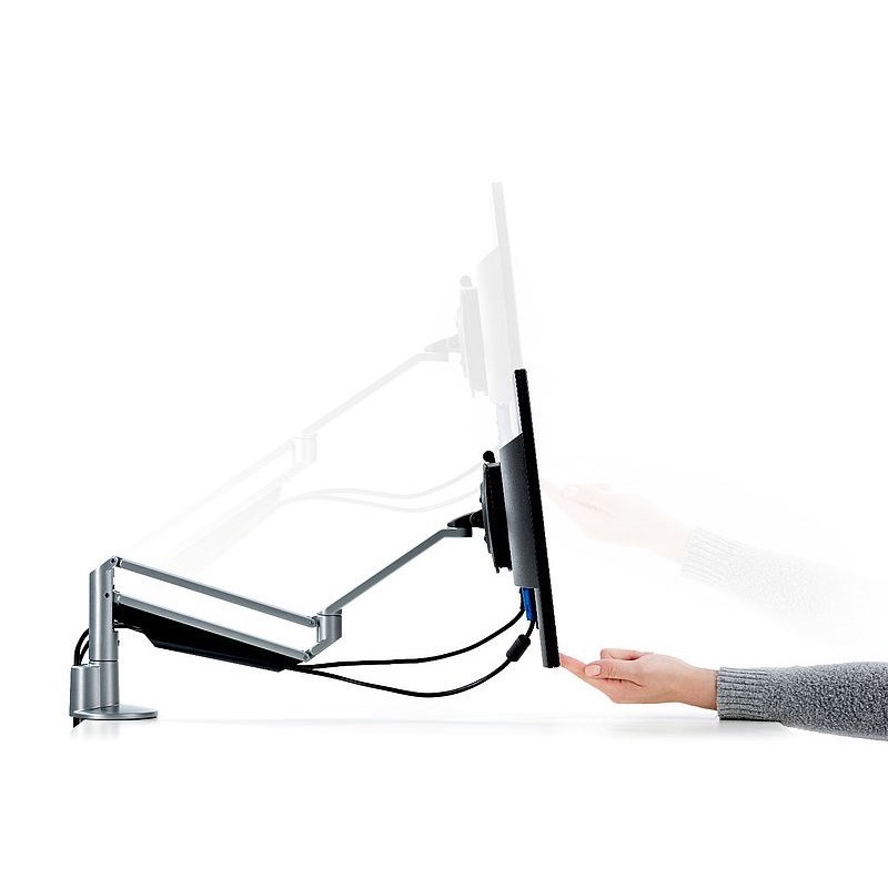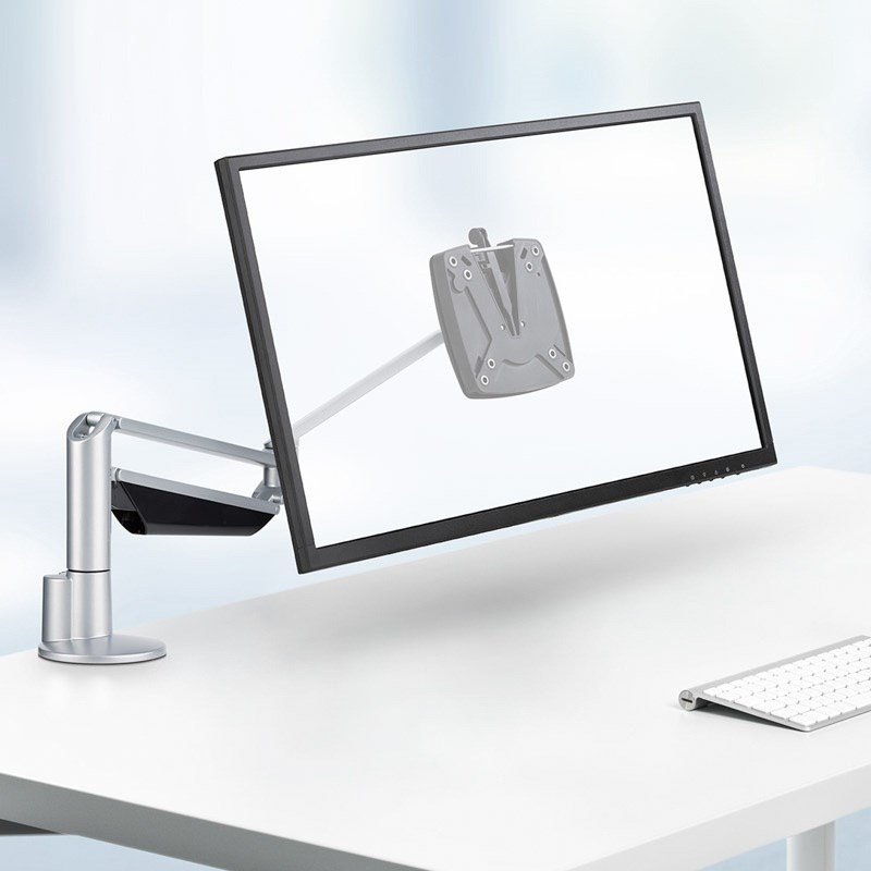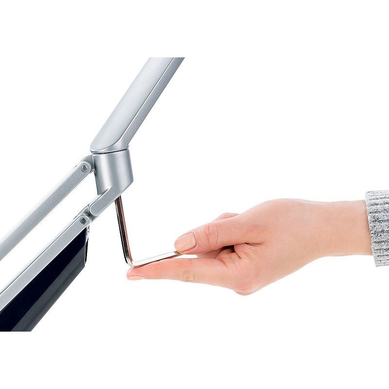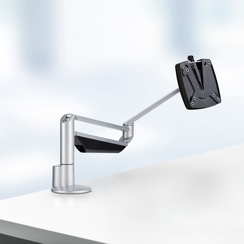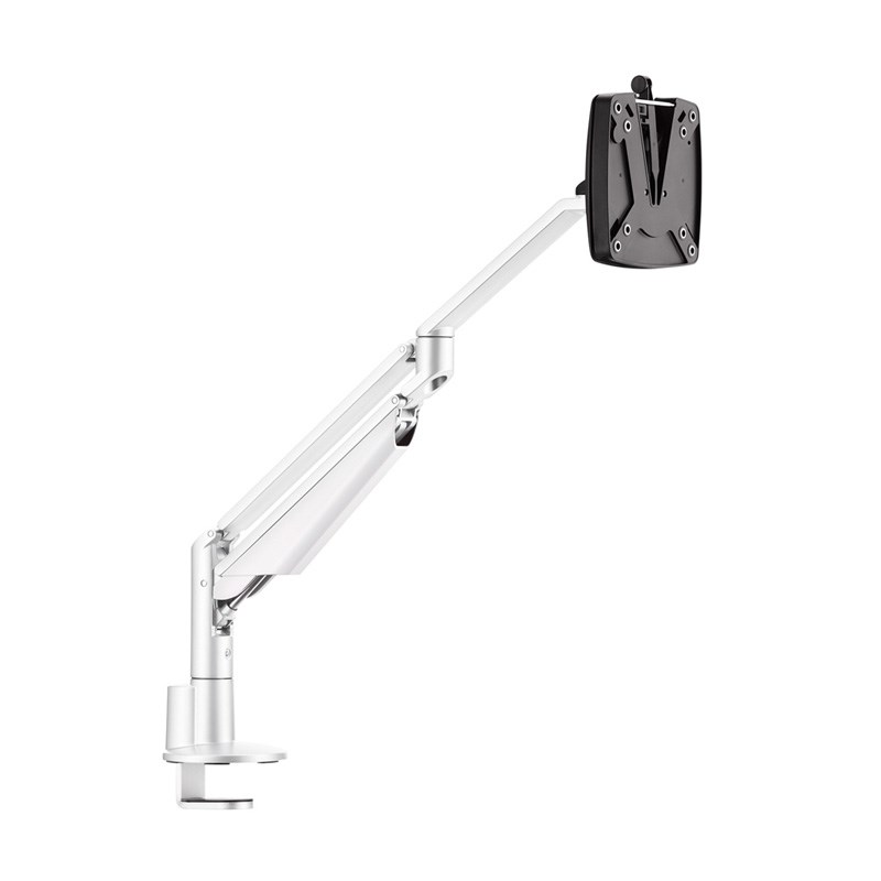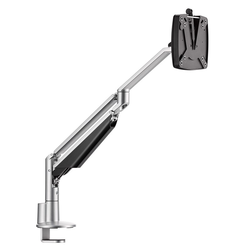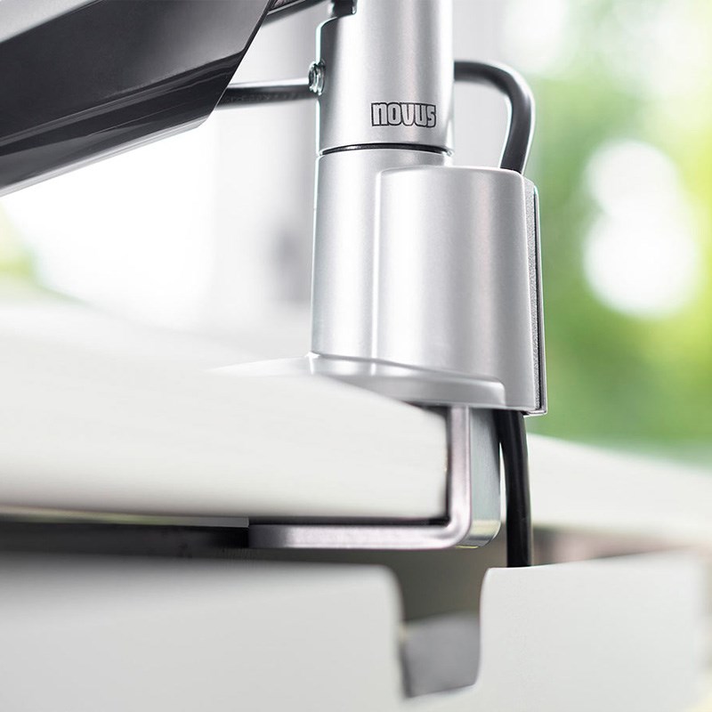 Novus CLU II nosač monitora dizajniran je s višim, dužim profilom za podizanje većeg monitora u udoban položaj za gledanje. Elegantna dvodijelna potporna ruka za monitor s tehnologijom plinskih opruga za udobno, ergonomsko podešavanje monitora. Kopče za kabele za čisti izgled.