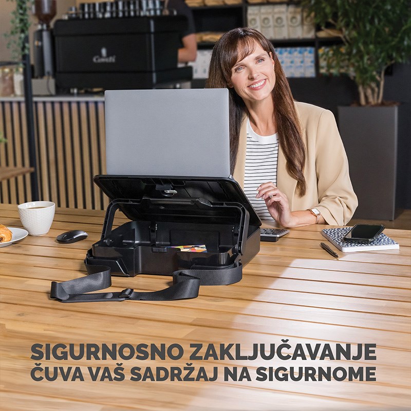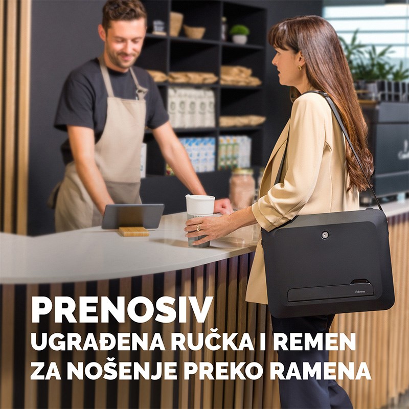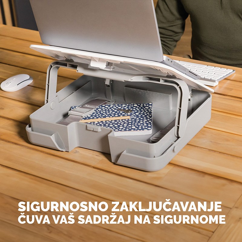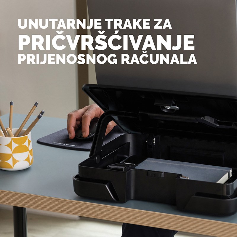 Fellowes vam nudi novi 2-u-1 proizvod: torbu/kutiju za laptop u kombinaciji sa stalkom. Prenosiv, jednostavan za postavljanje, podešavanje i skladištenje, idealan je za hibridni rad.
