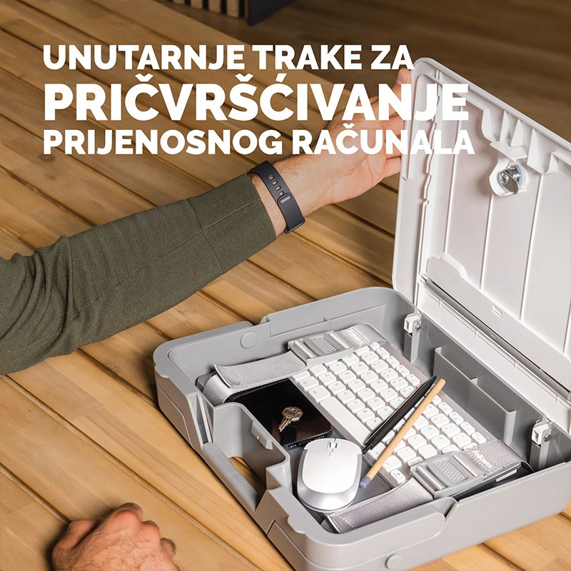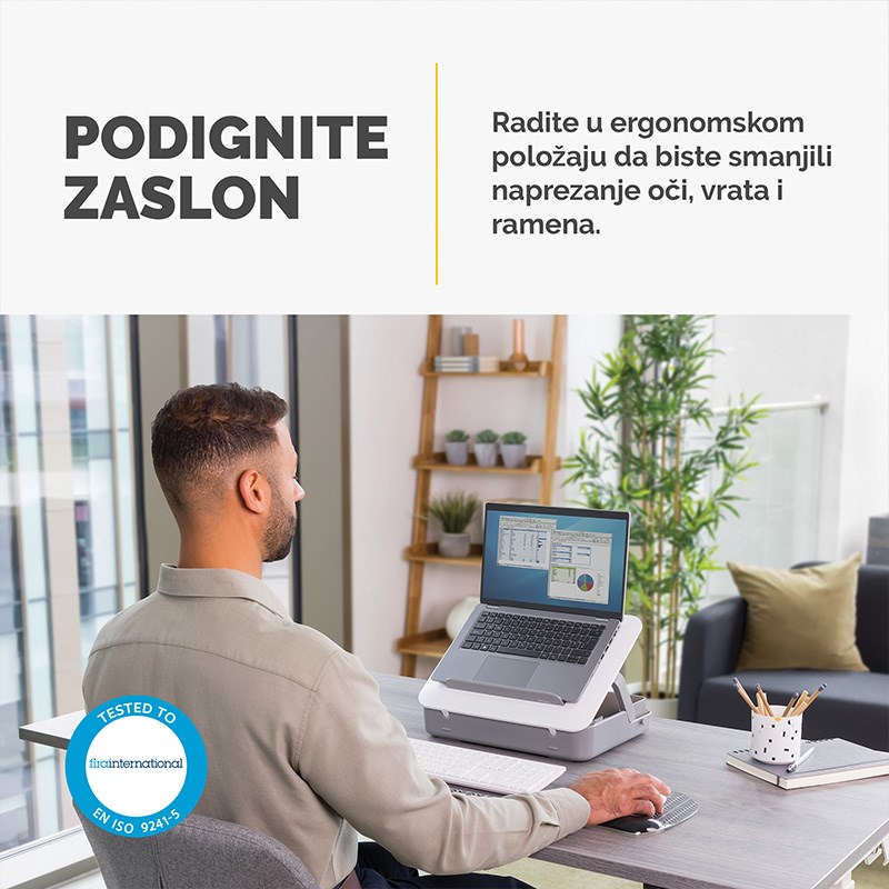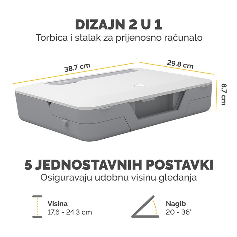 Kutija se slaže u stalak za laptop te nudi 5 visina prilagodbe za veću ergonomsku udobnost gdje god da ste.