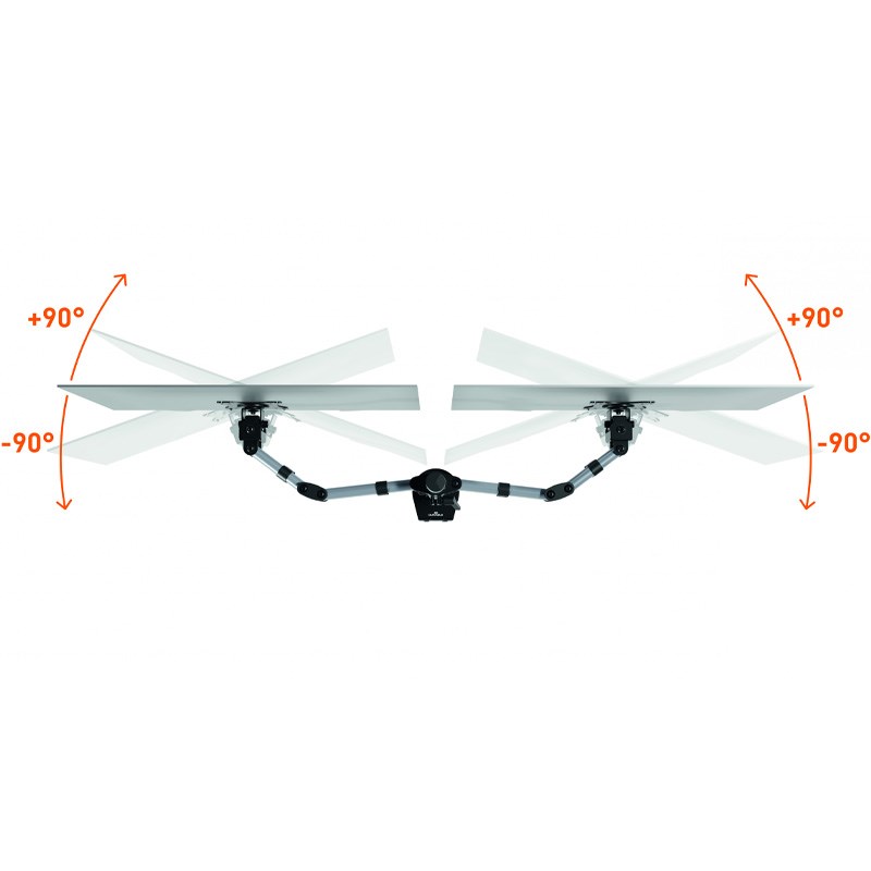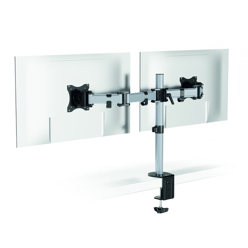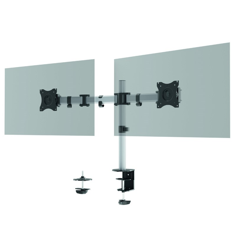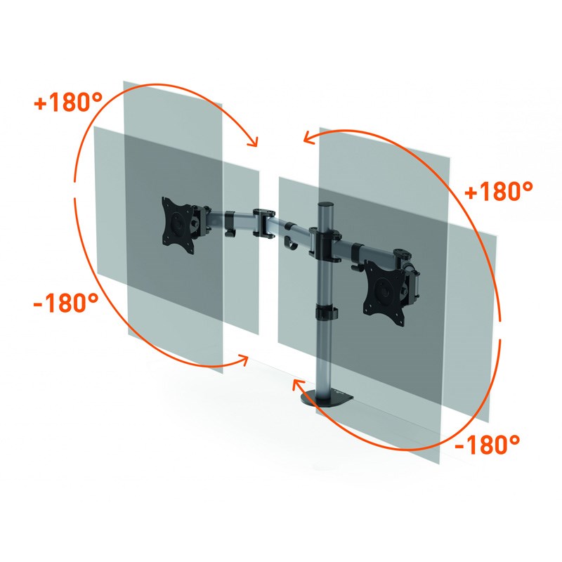 Nosač monitora za 2 zaslona s mogućnosti pojedinačne montaže putem pričvršćivanja vijcima ili stezaljke za stol. Visina, nagib i položaj monitora mogu se lako i pojedinačno podesiti kako bi se olakšao ergonomski rad. Može se rotirati za 360° za rad u portretnom ili pejzažnom načinu.
