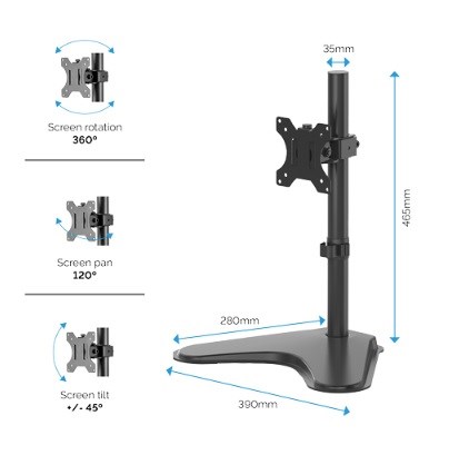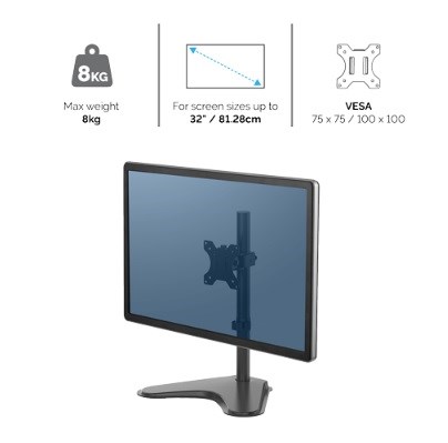 Nosač za monitor kako biste smanjili naprezanje očiju, vrata i ramena. Samostojeći dizajn omogućuje konfiguraciju držača monitora u prostorima koji ne dopuštaju montažu stezaljke ili utora. Jednostavan dizajn s ugrađenim upravljanjem kabelima smanjuje nered. Nizak profil, opterećena baza pruža poboljšanu stabilnost. ako ostvarite udobnost gledanja s 46 cm podesivosti visine. Drži monitore do 32” (81,28 cm) i težine do 8 kg."