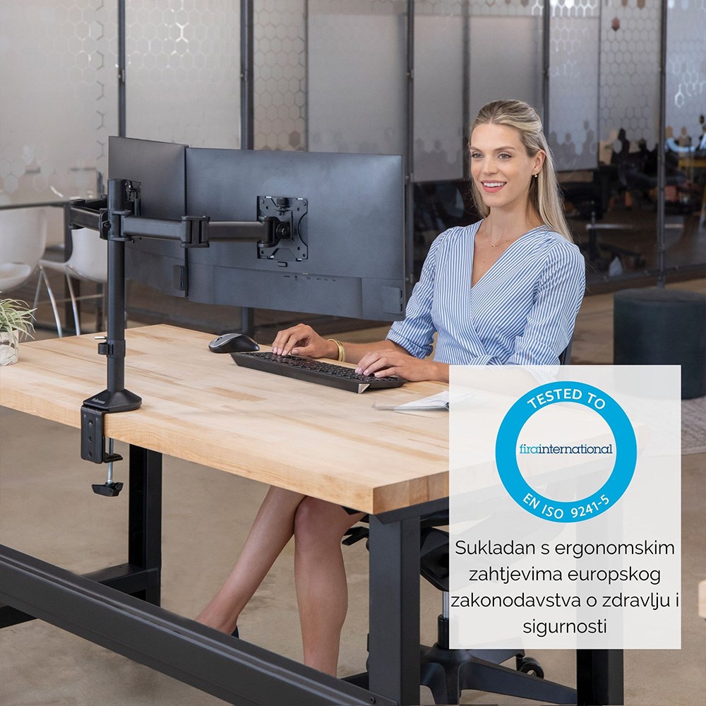 Stvorite produktivan radni prostor s više zaslona s Reflex Dual držačem monitora. Potpuno podesivo po visini i dubini za optimalnu kontrolu gledanja i isplativo ergonomsko rješenje. Jednostavan dizajn s ugrađenim upravljanjem kabelima koje onemogućava zapetljavanje. Postignite savršenu poziciju i udobnost s maksimalnom visinom od 45 cm i 38 cm dosega. Drži monitore od 27” (68,5 cm) do 8 kg težine svaki. Jednostavno pričvršćivanje stezaljkom za stol.