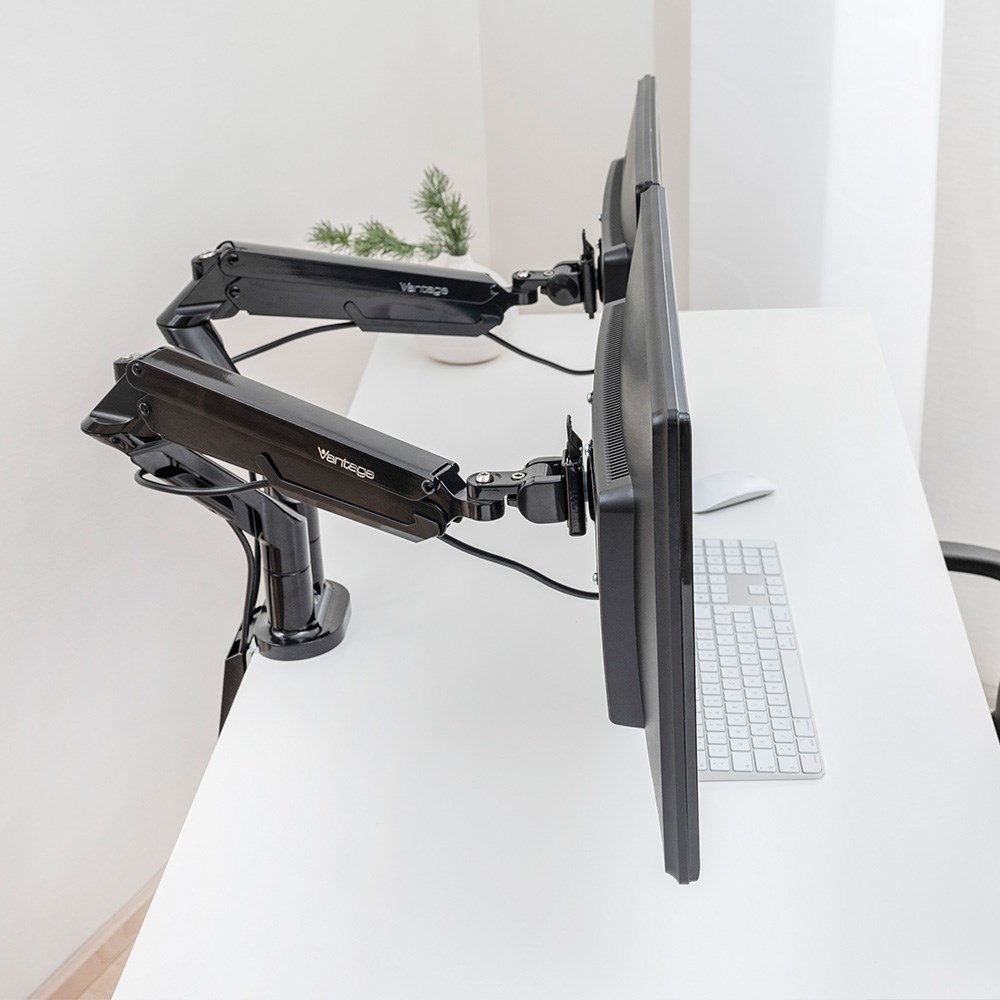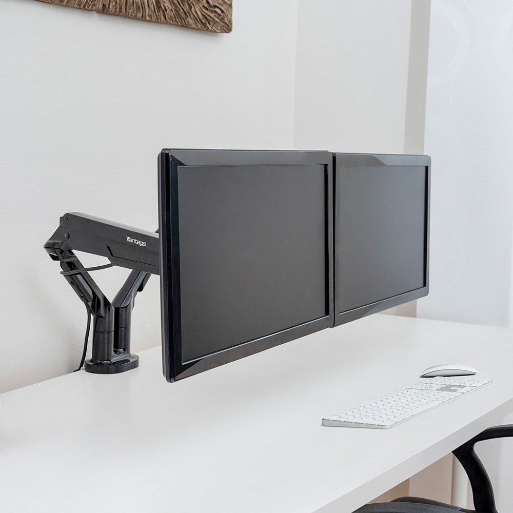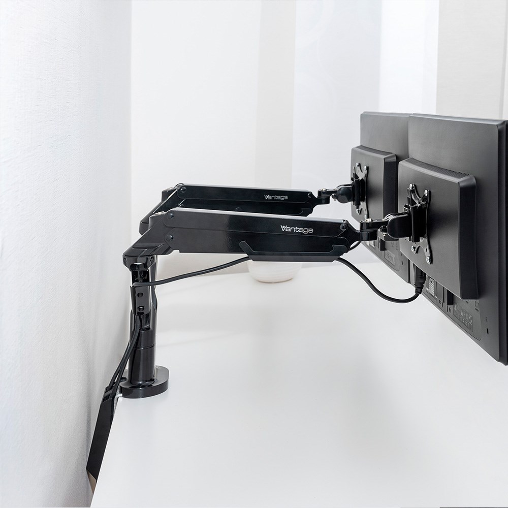 Nosač za 2 monitora s tehnologijom plinske opruge za jednostavno, ergonomsko podešavanje monitora. Raspon 1.260 mm (uključujući stezaljku) (pojedinačna kraka 600 mm svaki). Maksimalna visina VESA 510mm Mogućnost rotiranja do 270° (+/-135°) stupnja