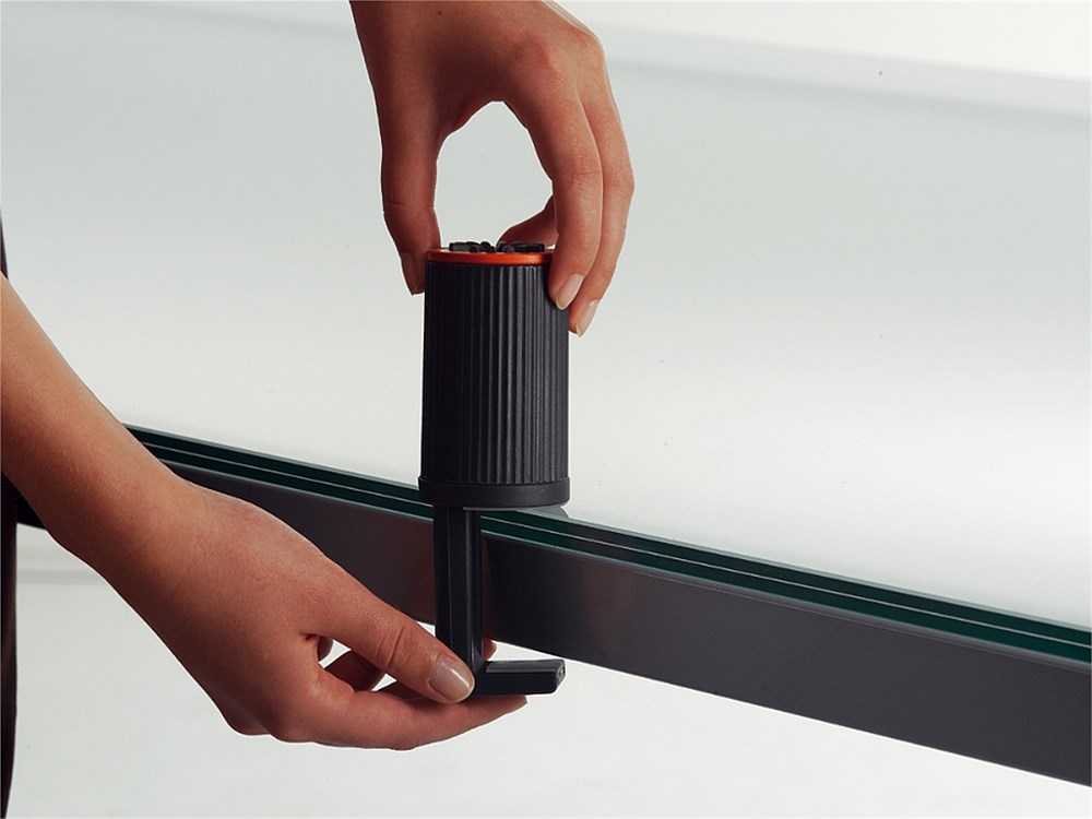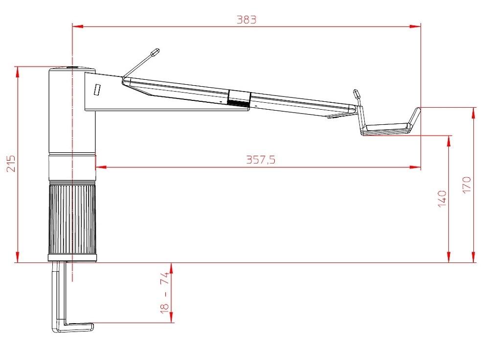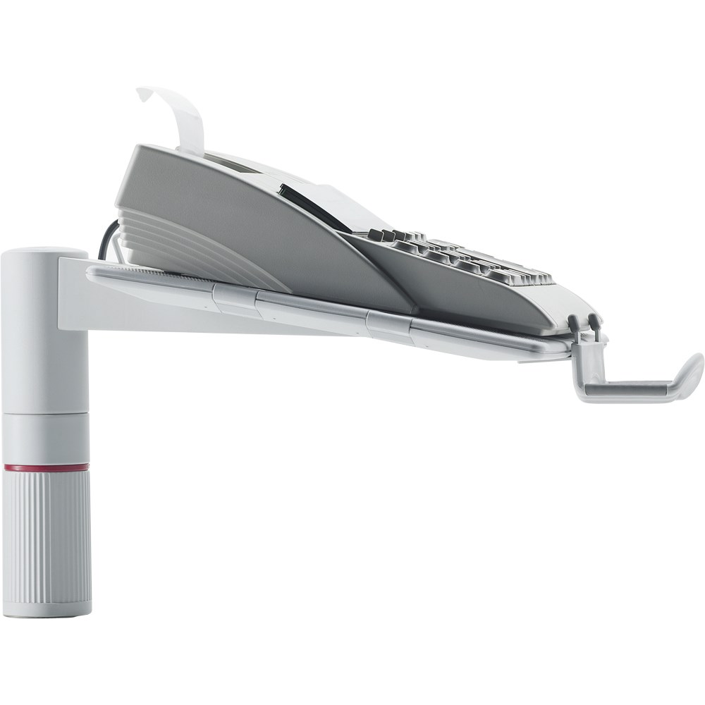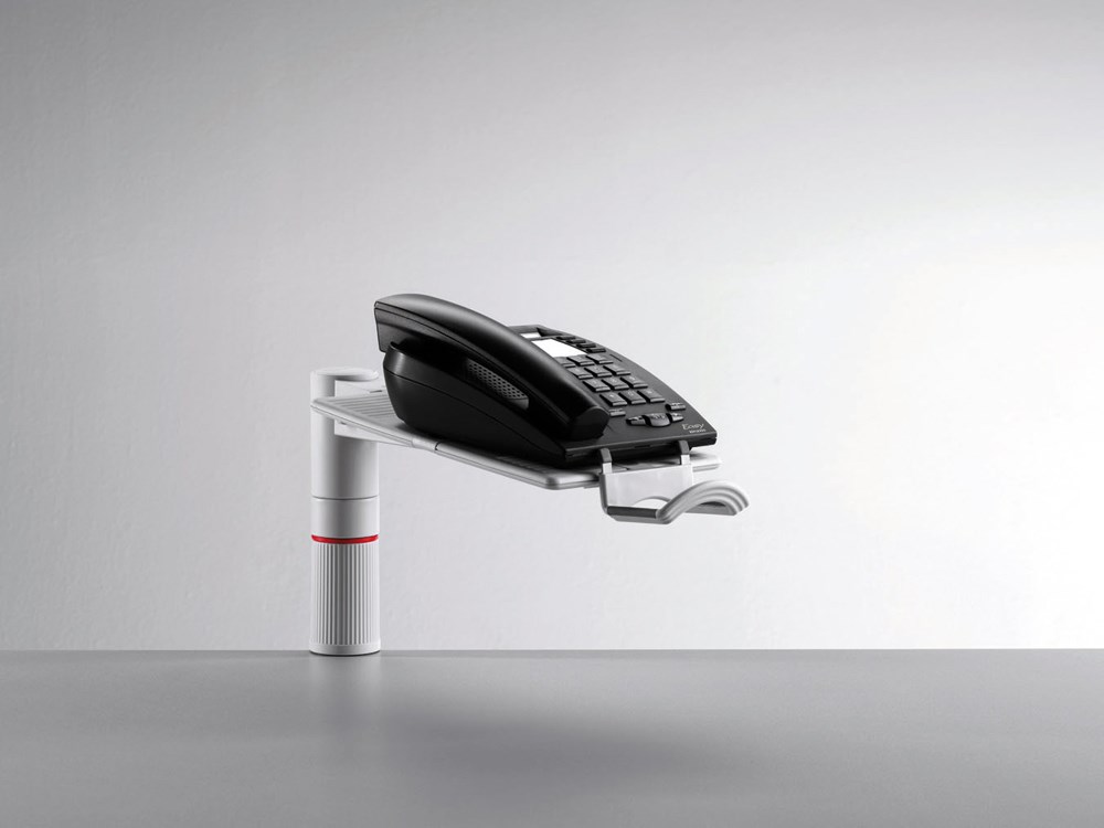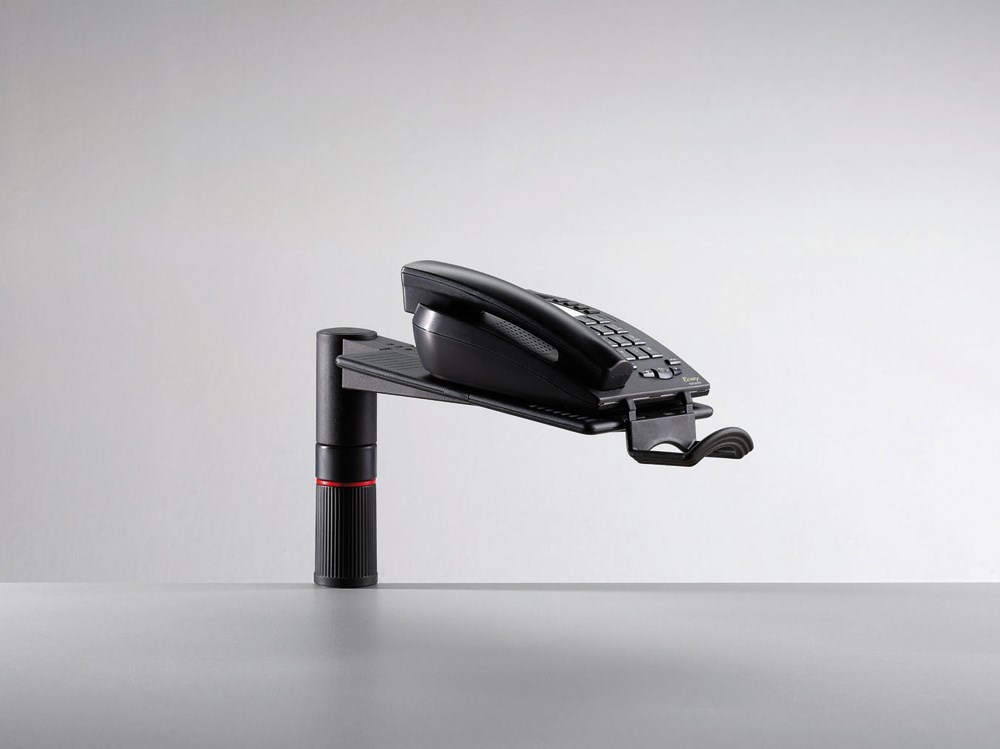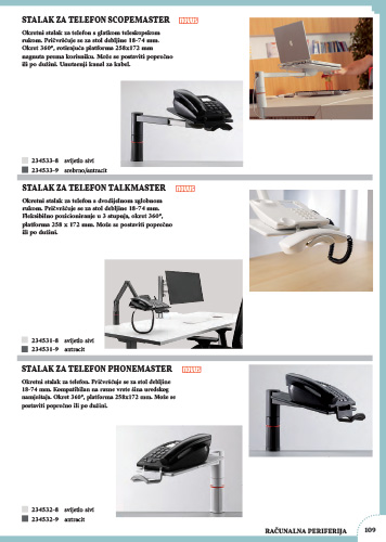Okretni stalak za telefon. Pričvršćuje se za stol debljine 18-74 mm. Kompatibilan na razne vrste šina uredskog namještaja. Okret 360*, platforma 258x172 mm može se postaviti poprečno ili po dužini.