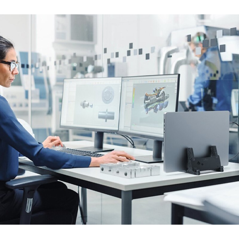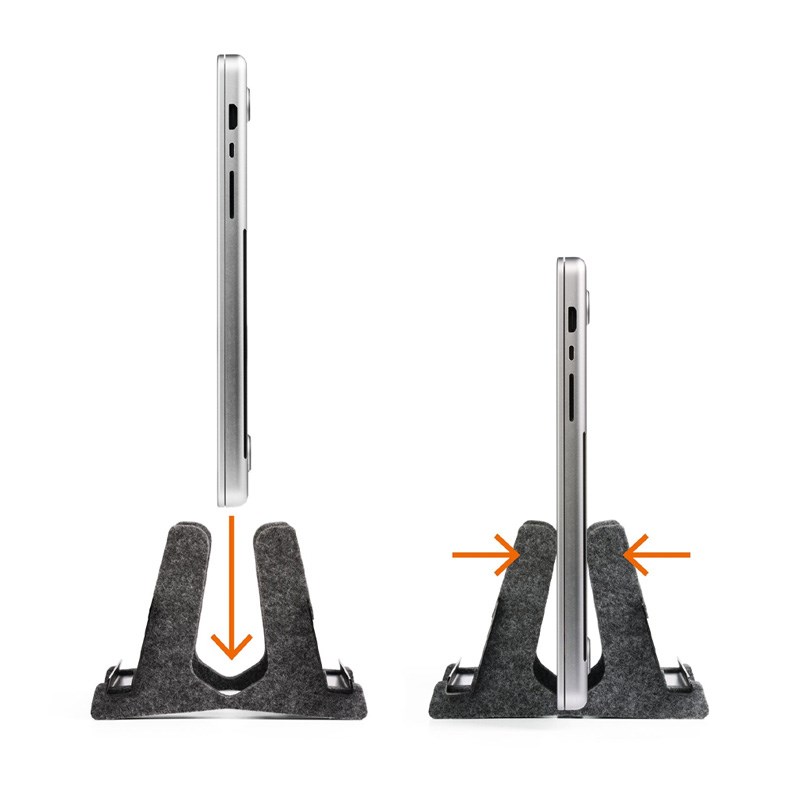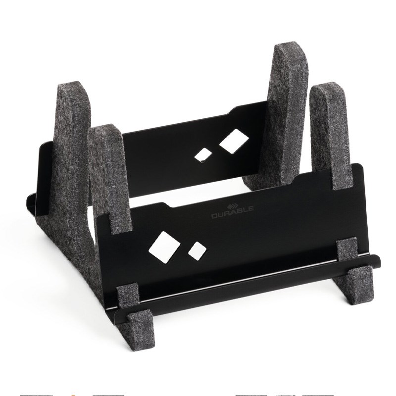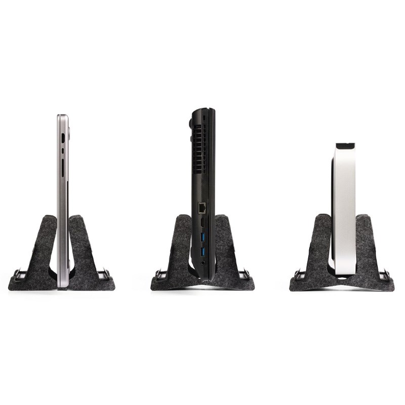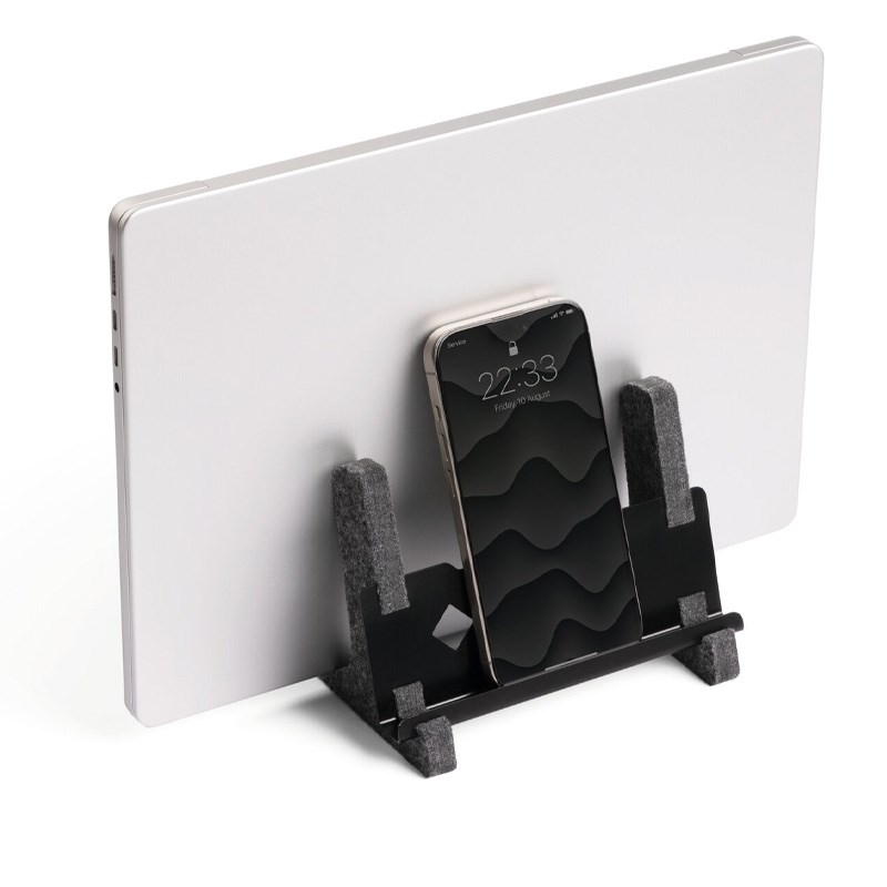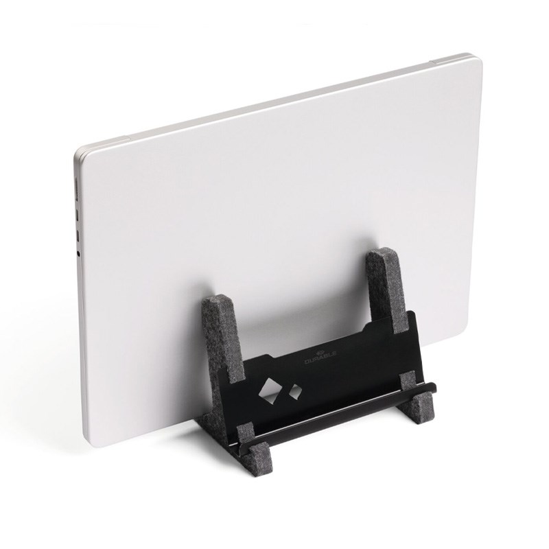 Vertikalni stalak za prijenosno računalo izrađen od metala i 60% recikliranog PET filca s integriranom policom za tablete ili mobilne telefone. Prikladno za sva prijenosna računala od 13"-17" i MacBookove s debljinom 10-36 mm i težinom od 0,9-3 kg.