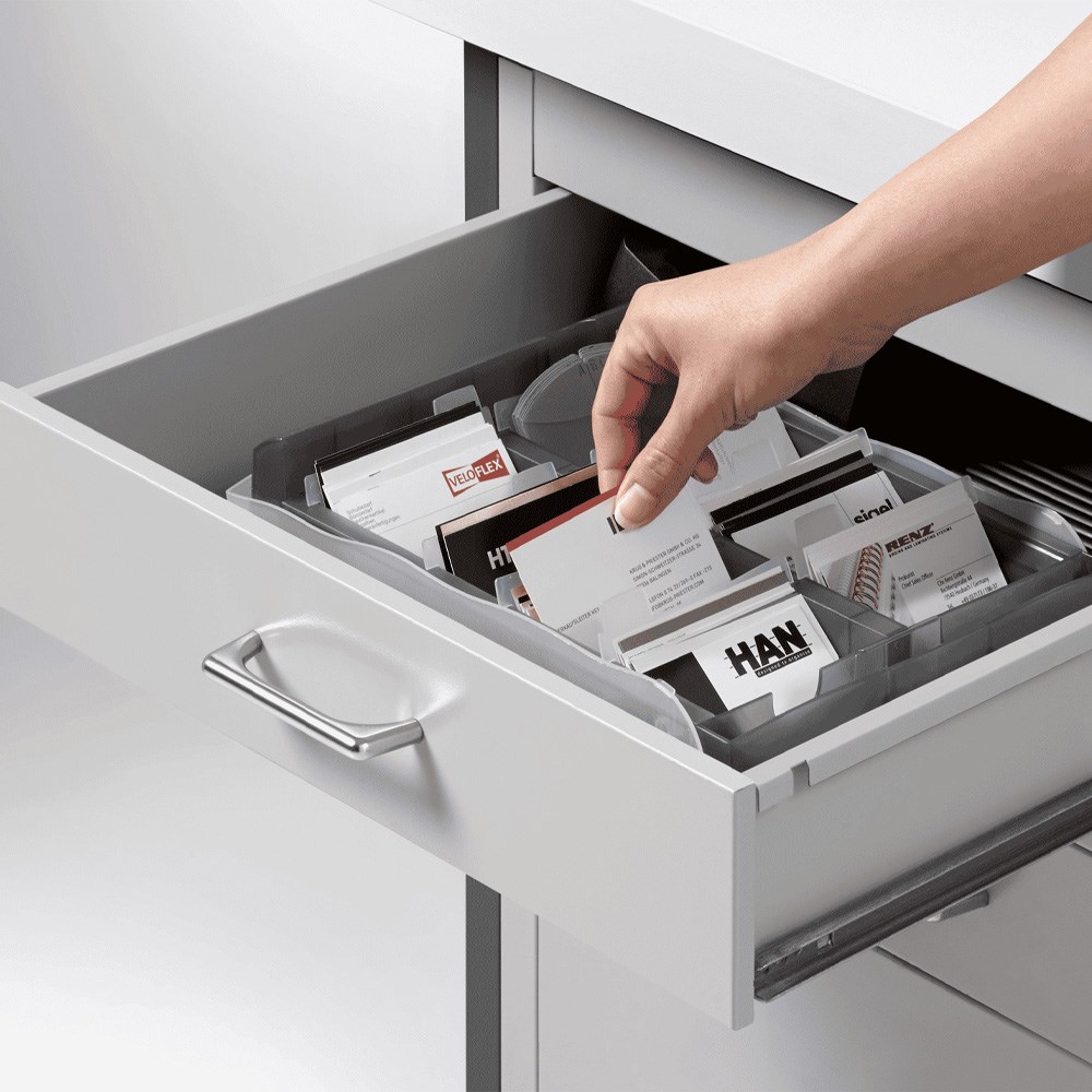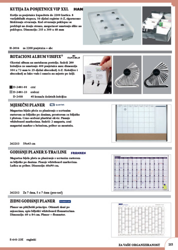 Kutija za posjetnice s 8 varijabilnih stupaca, 16-djelni registar A-Z, sigurnosno blokiranje otvaranja. Kod otvaranja poklopac se preklopi na donju stranu, mogućnost umetanja slike na poklopcu.